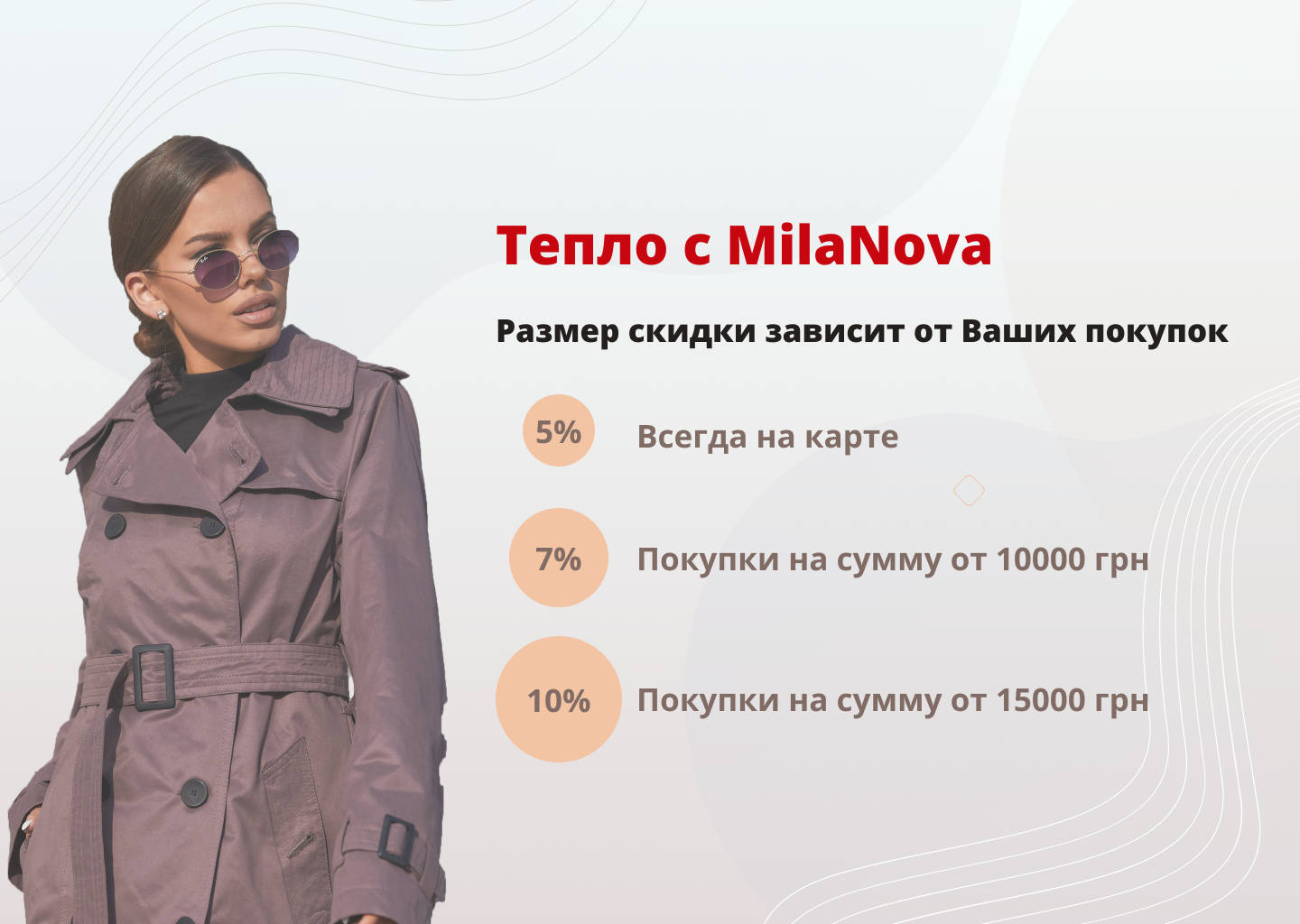 Для наших новых друзей и постоянных клиентов мы разработали Программу лояльности. Ее участники получают постоянные скидки на весь товар в интернет магазине milanova.com.ua