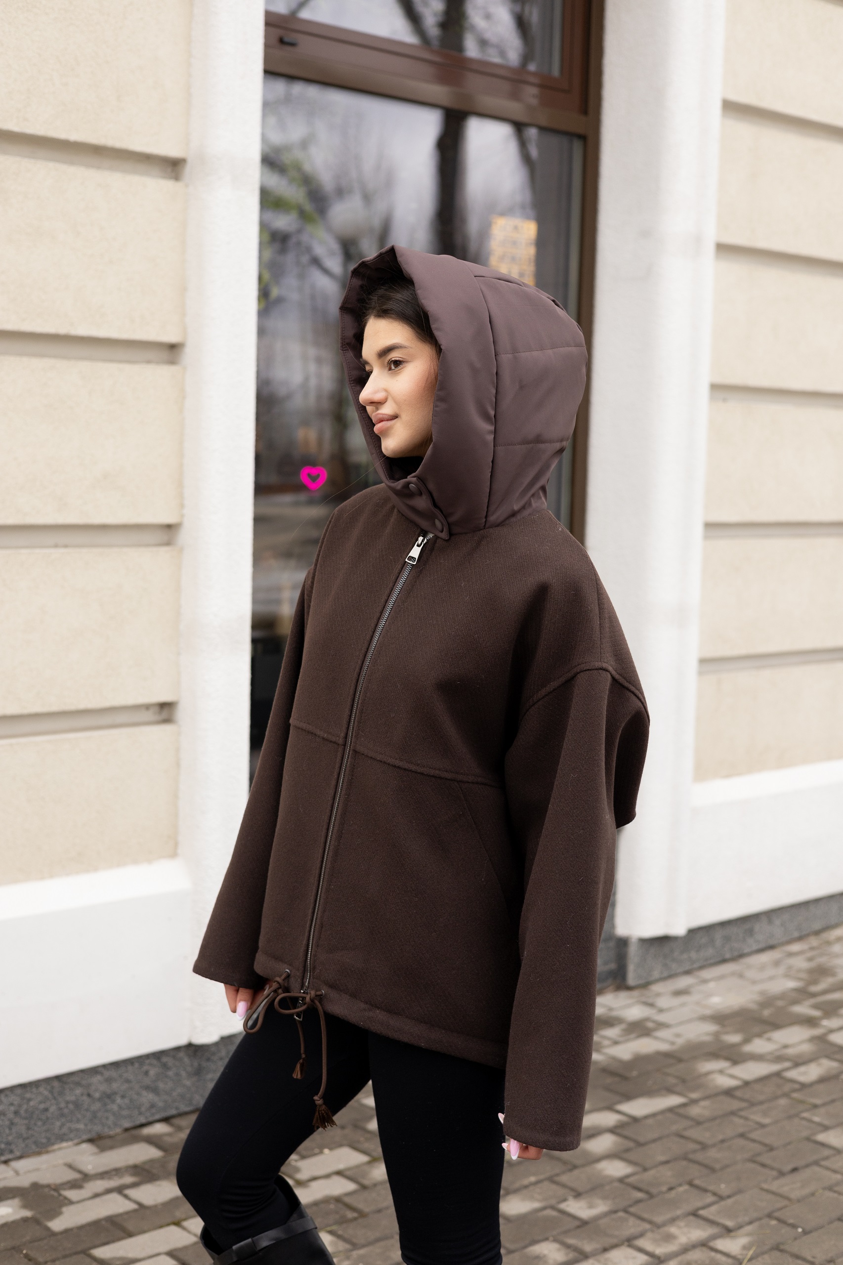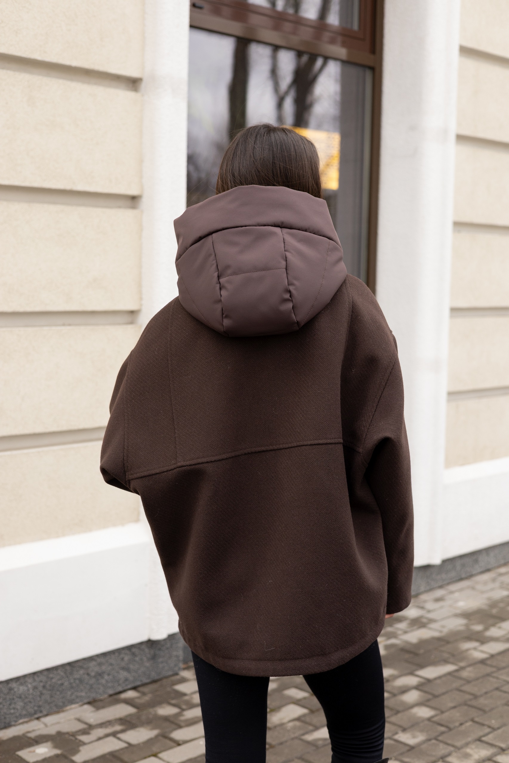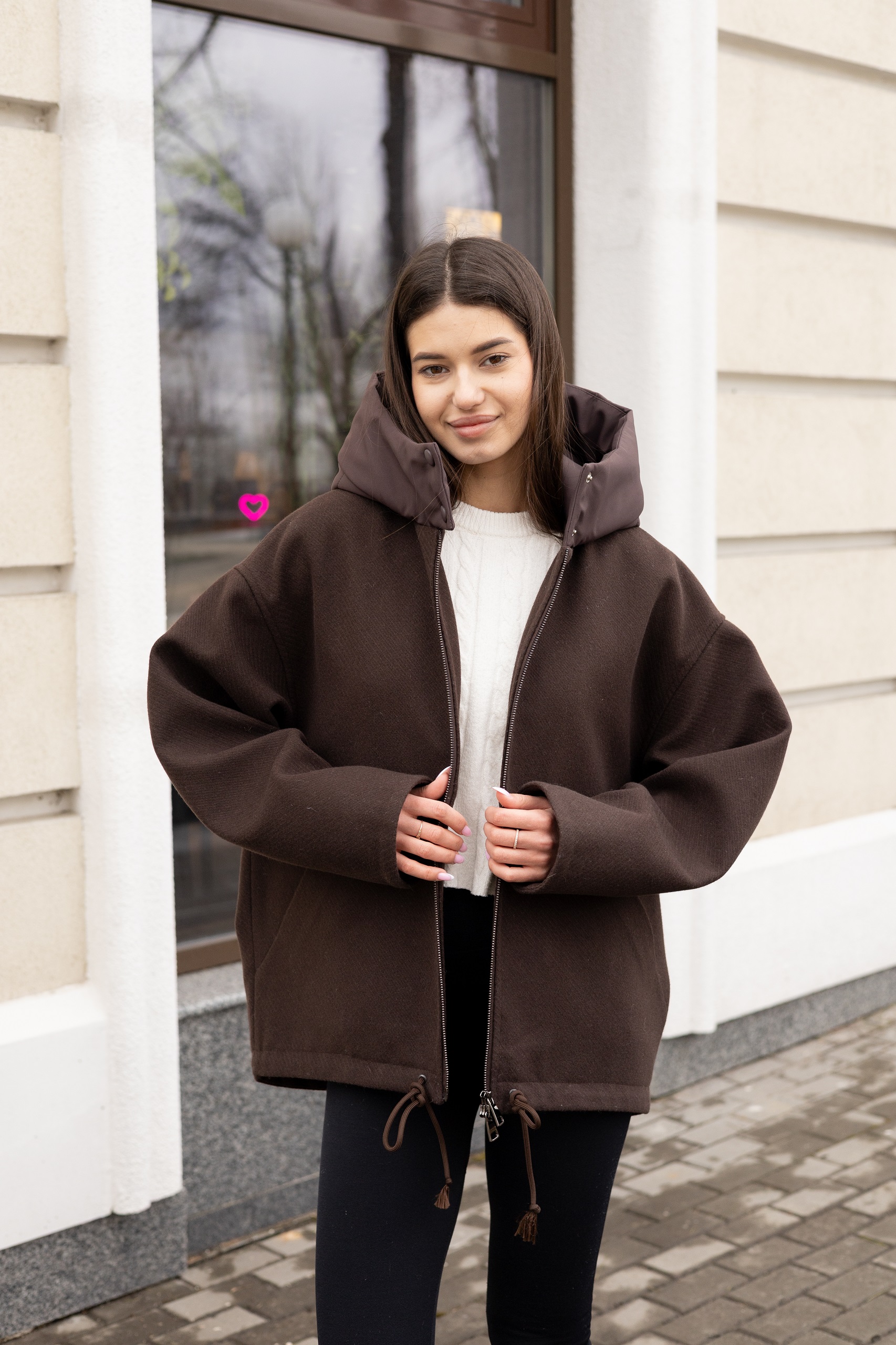 Современная куртка свободного кроя в глубокого коричневого оттенка — идеальный выбор для комфортных повседневных образов в прохладную погоду. Модель выполнена из плотного, мягкого материала, который сохраняет тепло и приятен к телу.