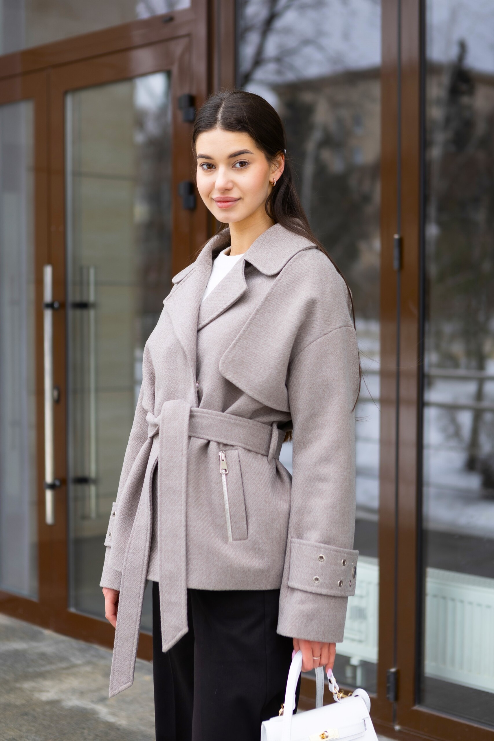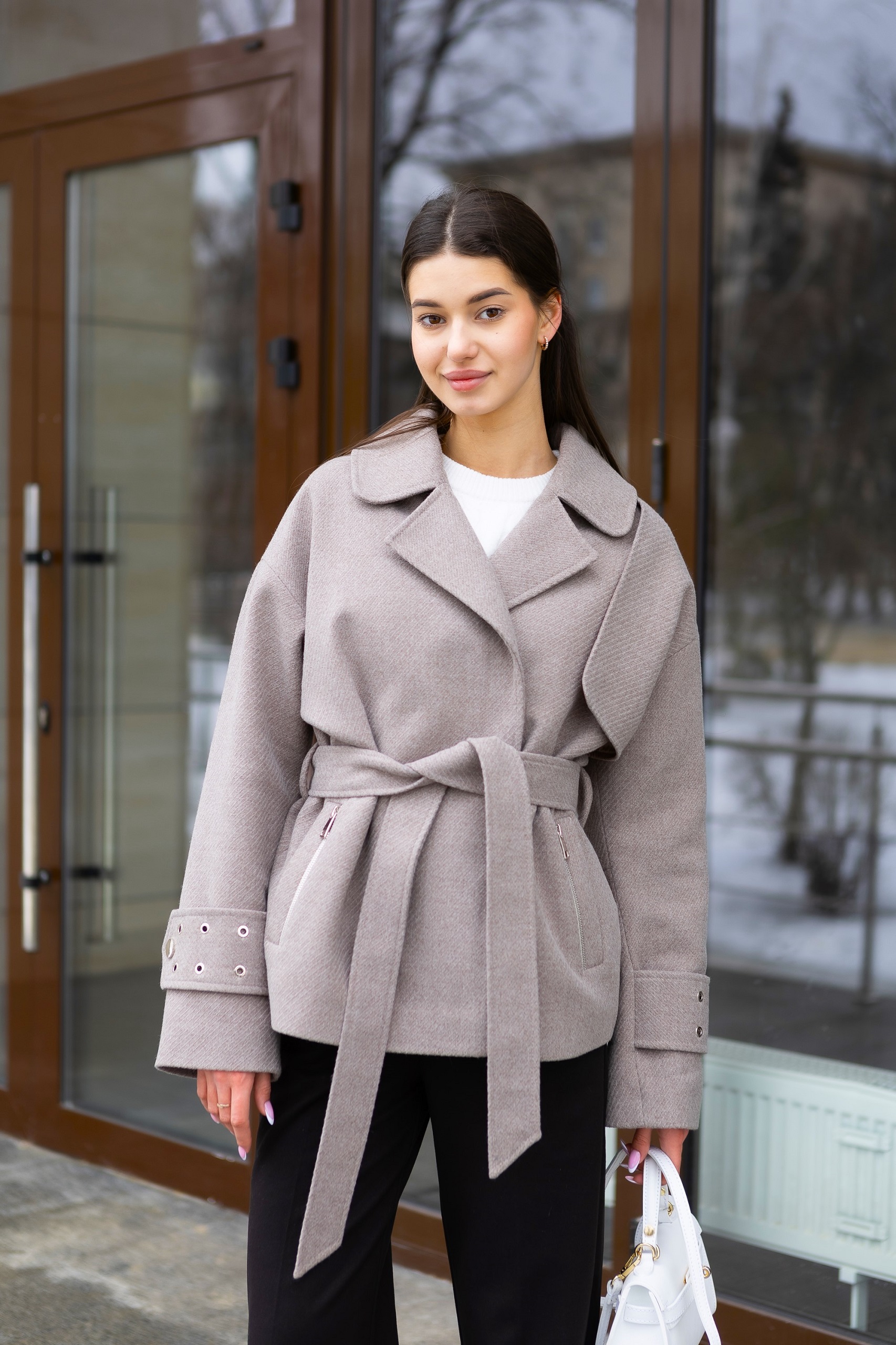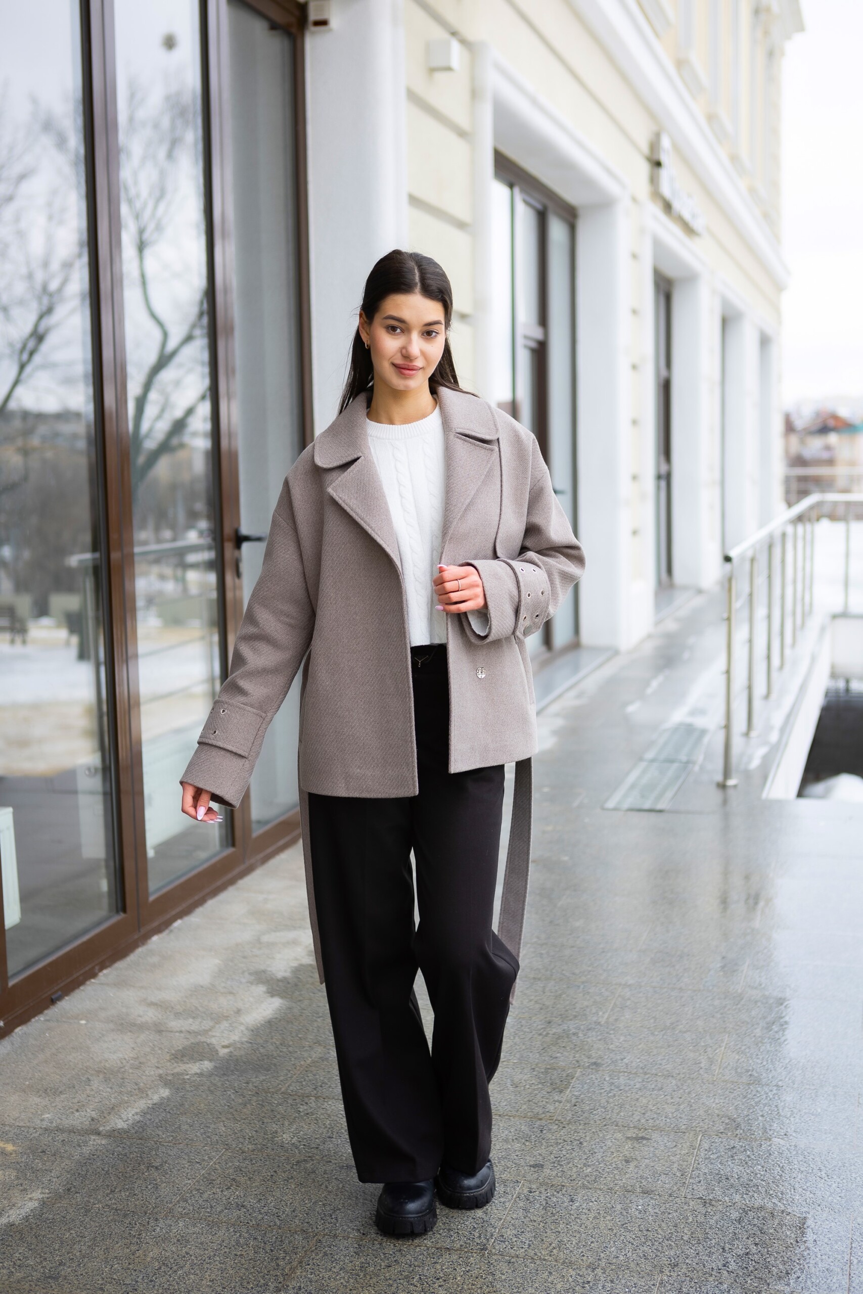 Кашемировое демисезонное укороченное пальто с поясом.