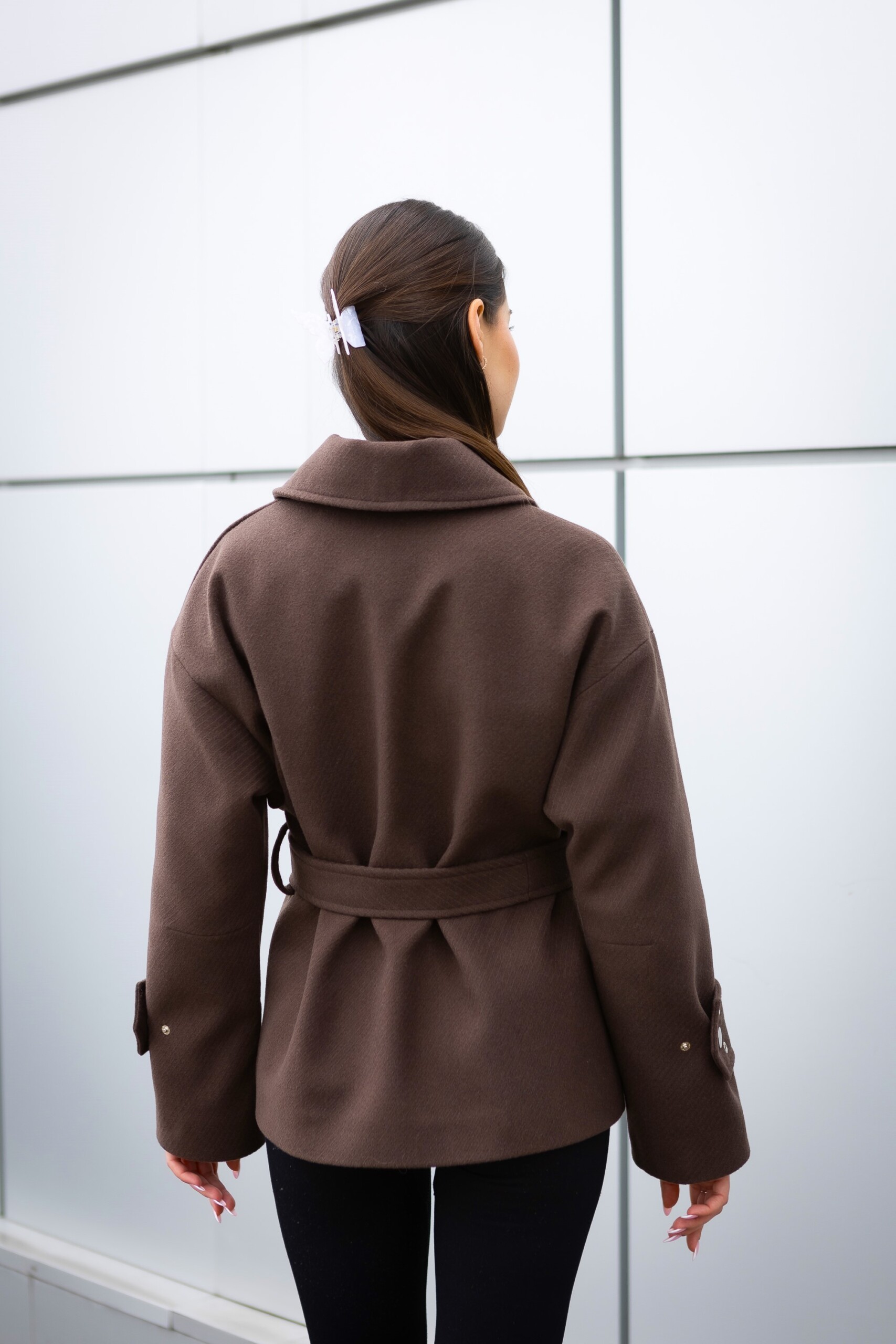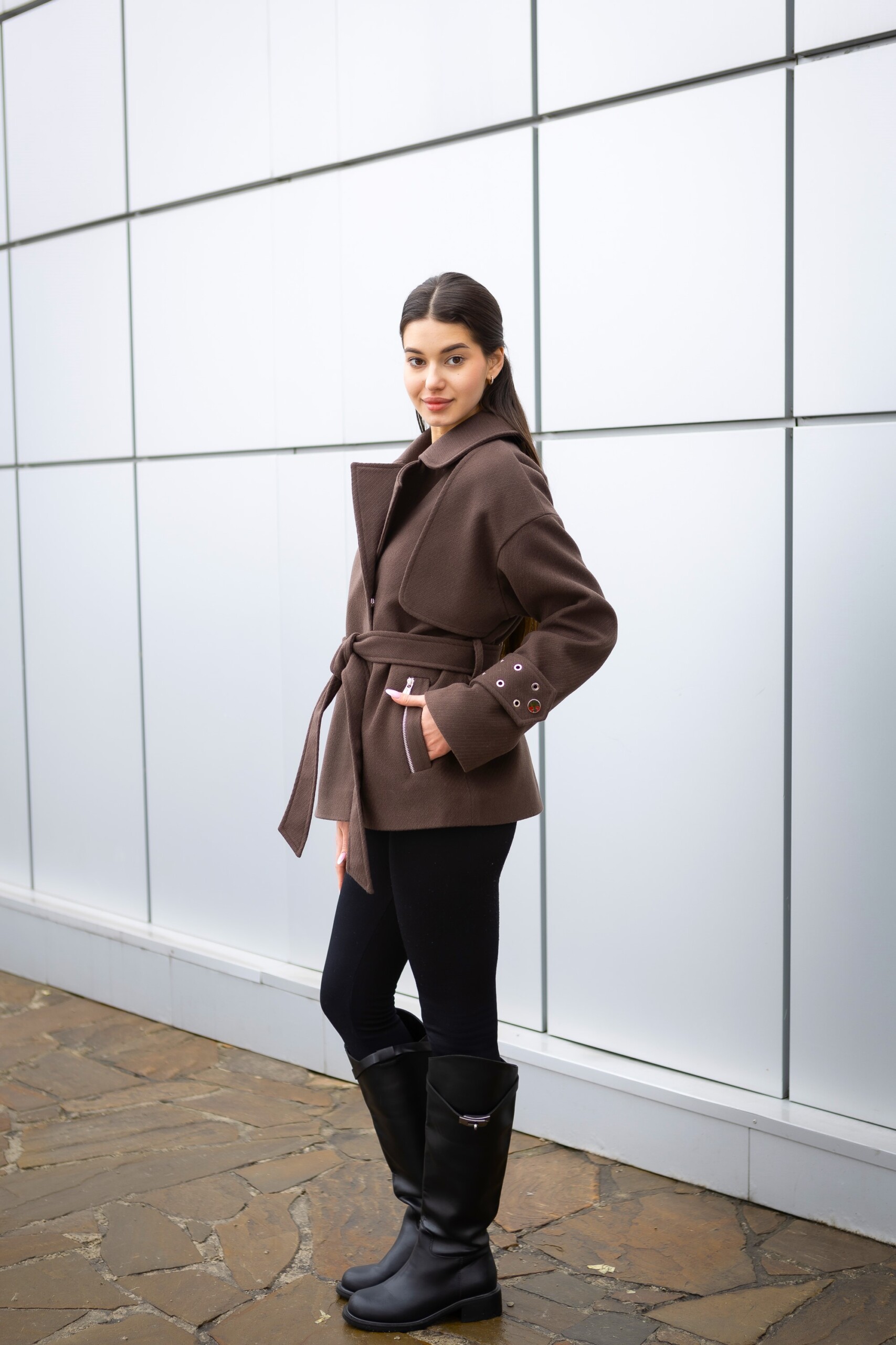 Кашемировое демисезонное укороченное пальто с поясом.