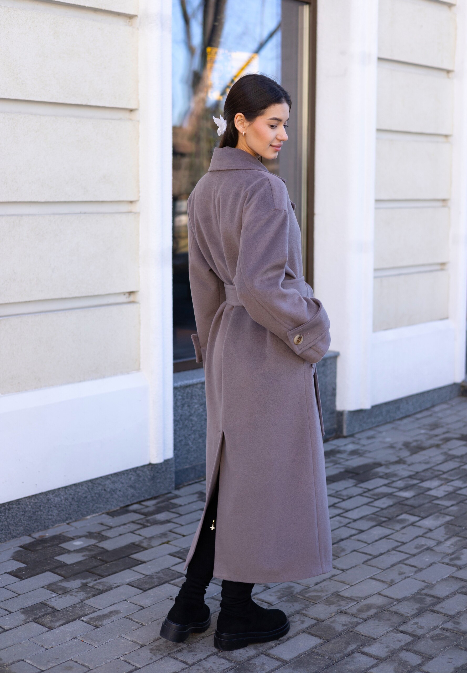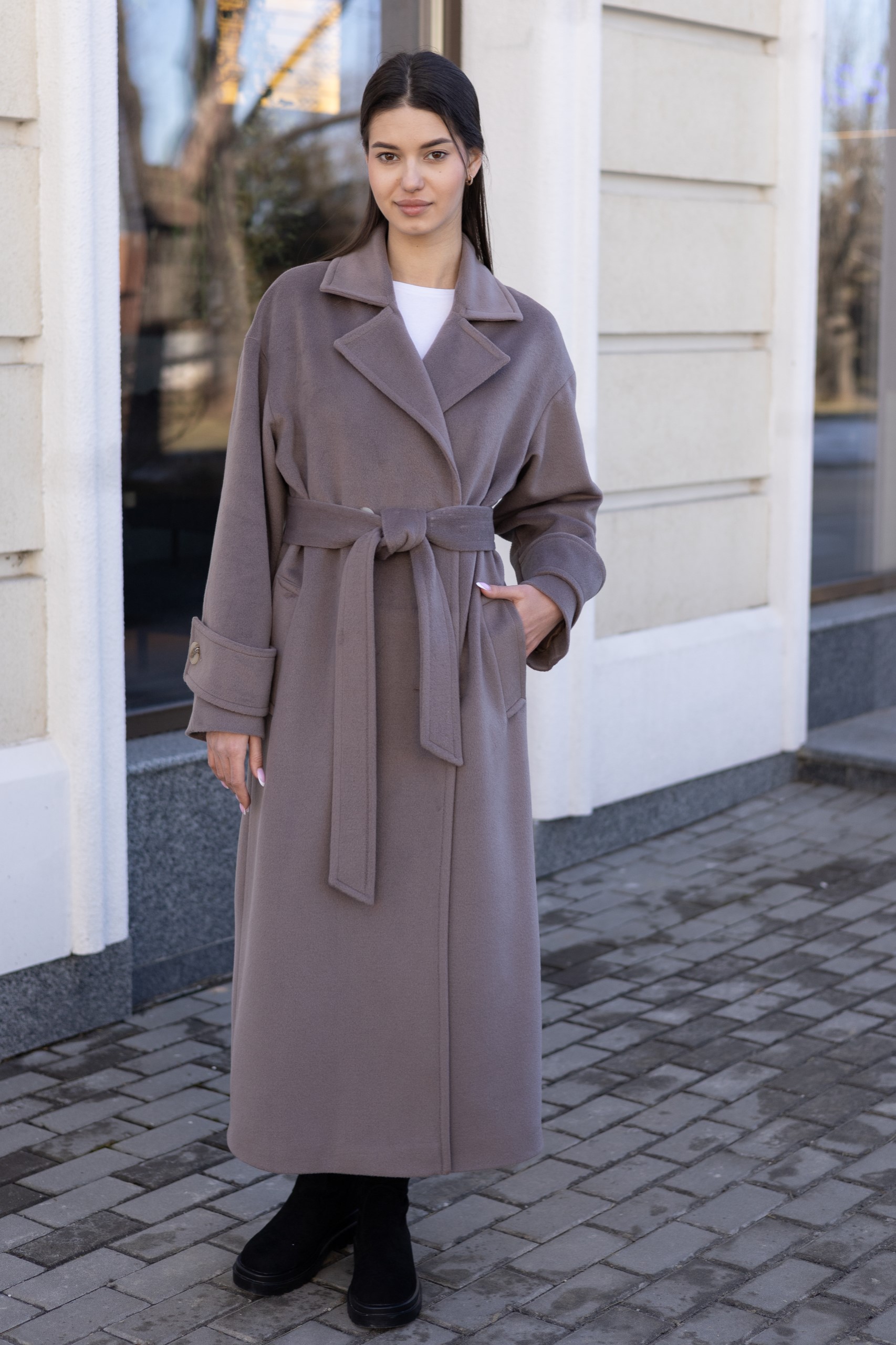 Кашемировое демисезонное пальто с поясом.