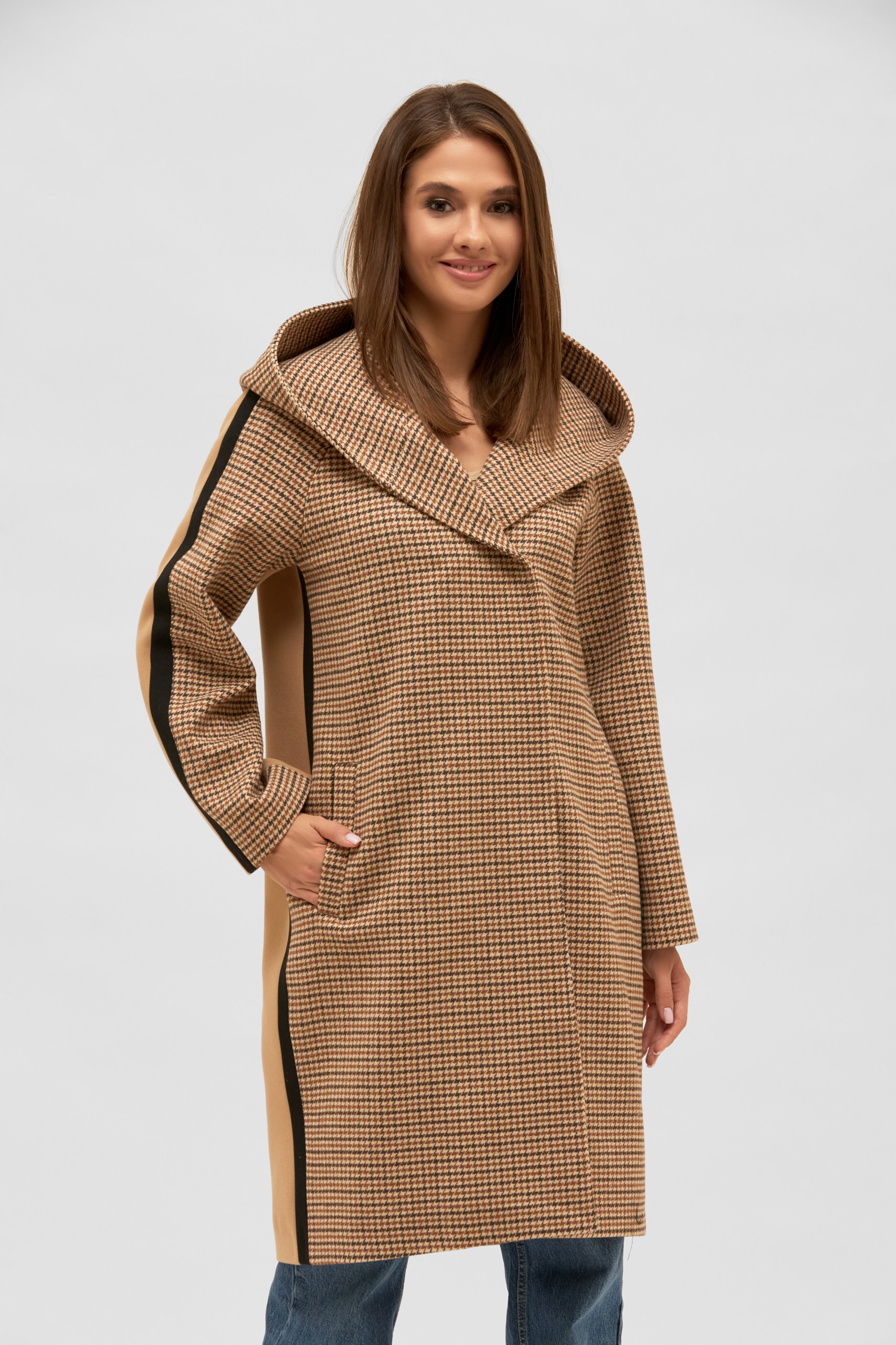 Демисезонное пальто на запáх от дизайнеров MilaNova, выполненное из мягкого эко-кашемира в модный принт с лампасами: объемый капюшон, заниженная линия плеча, два врезных кармана по бокам и съемный пояс.