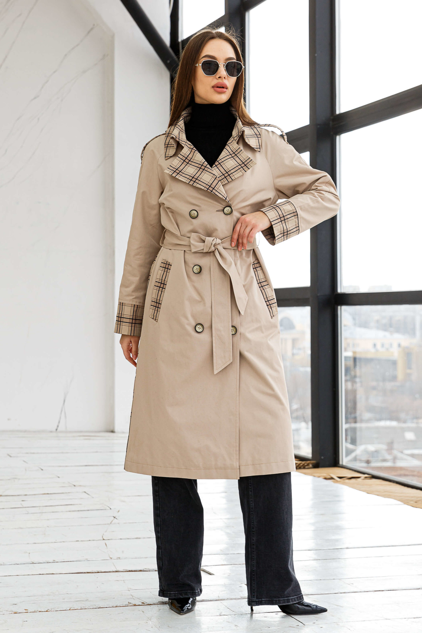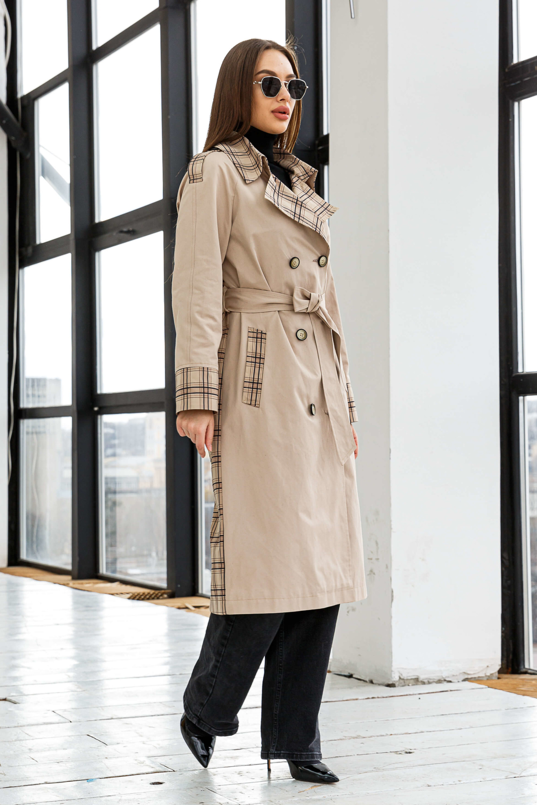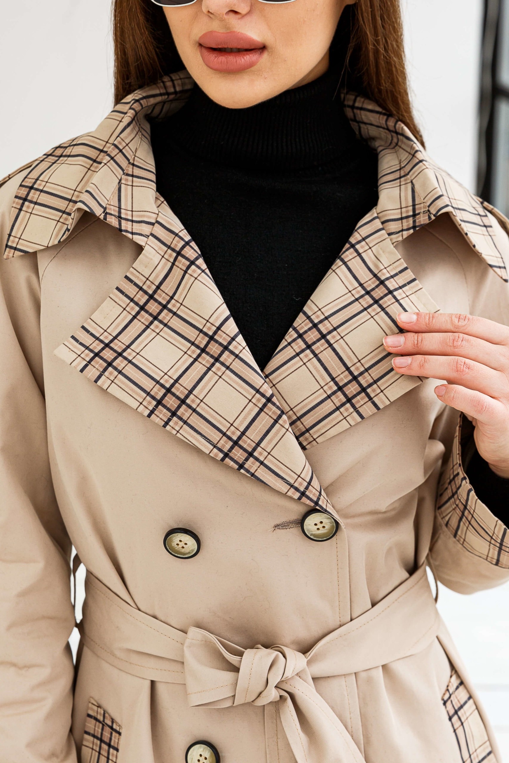 Демисезонный комбинированный Тренч Mila Nova порадует модниц, клечатая спинка и отделка на карманах и вороте выделит из городской суеты.