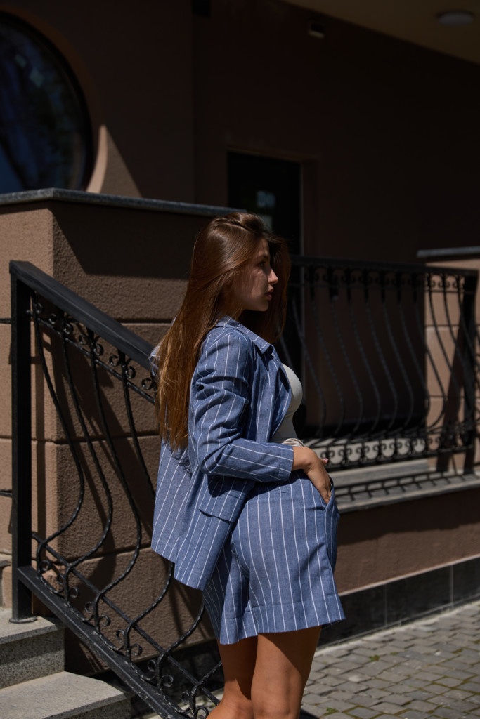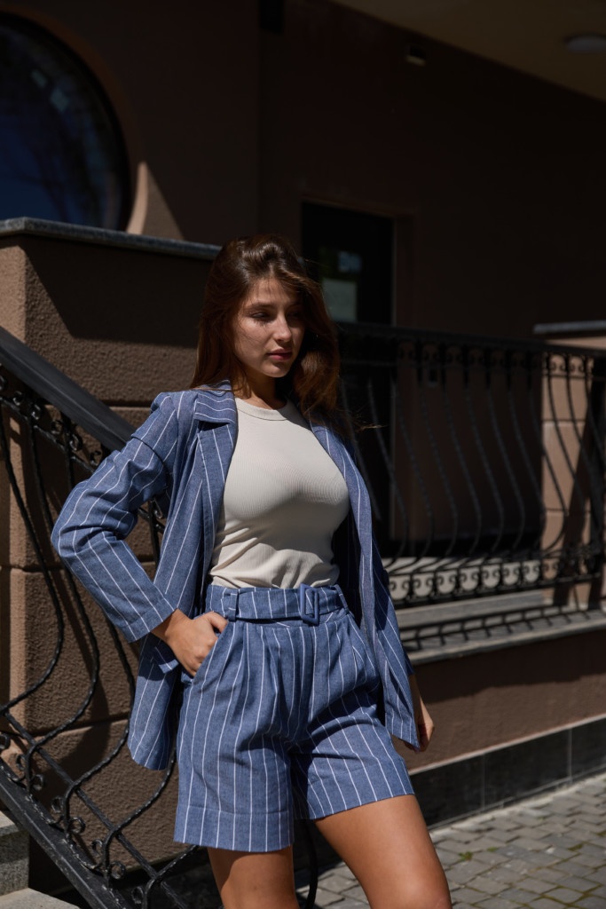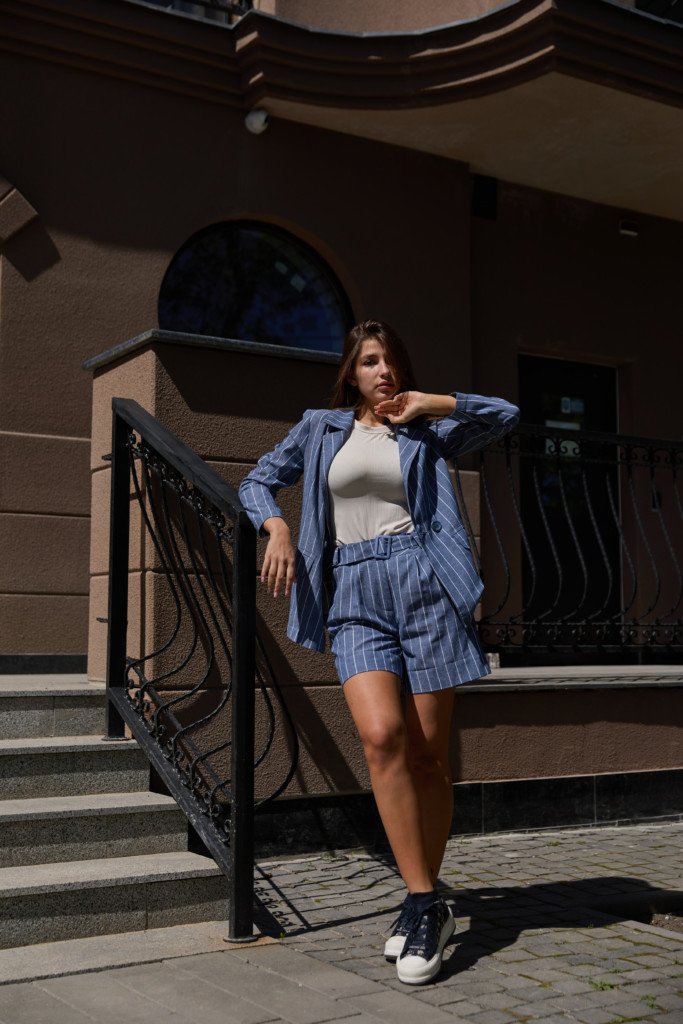 Короткие шорты на поясе с пряжкой и лаконичный дизайн пиджака, который вы сможете сочетать с обувью и аксессуарами в любом стиле, создавая свой неповторимый образ.