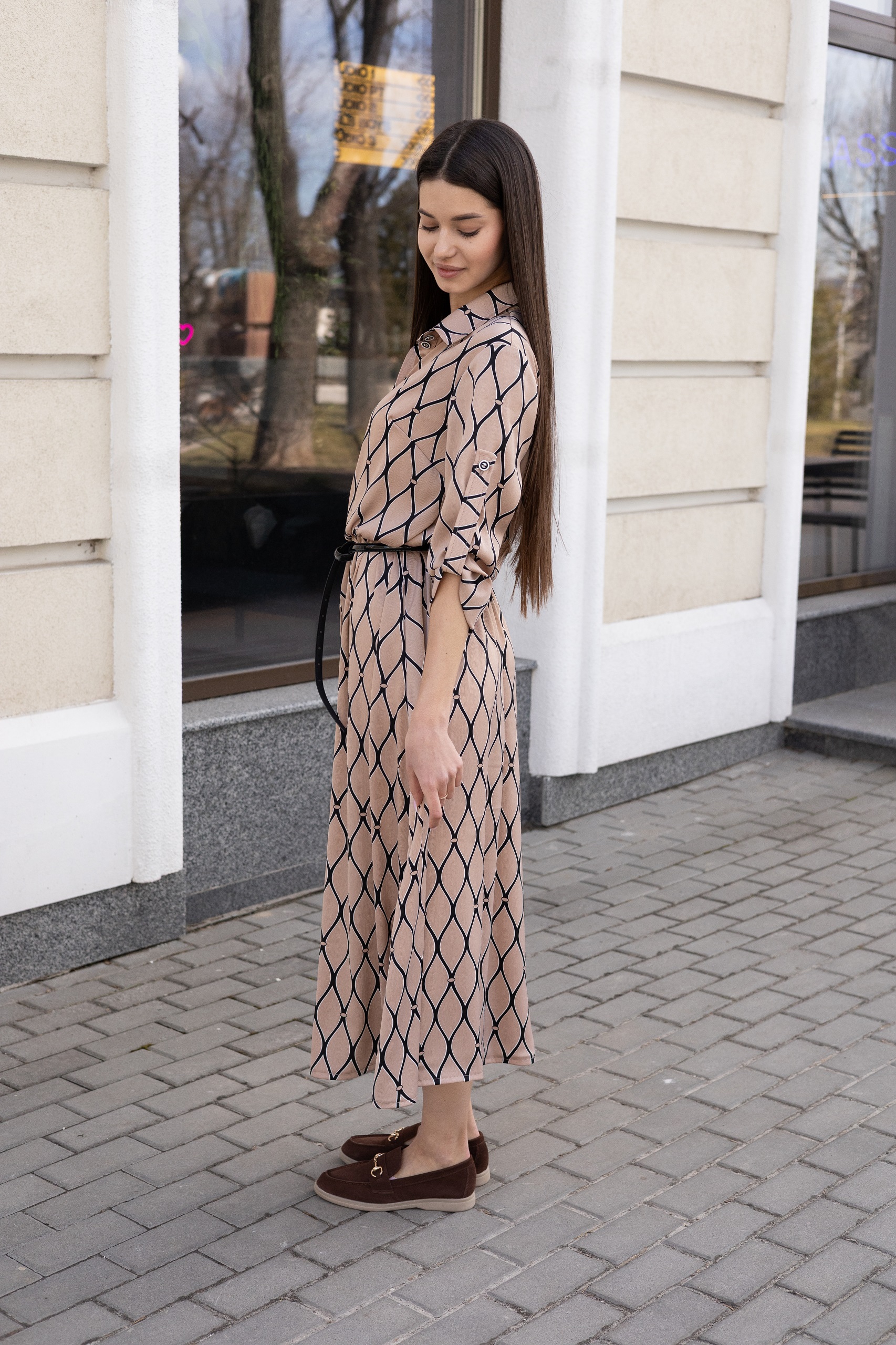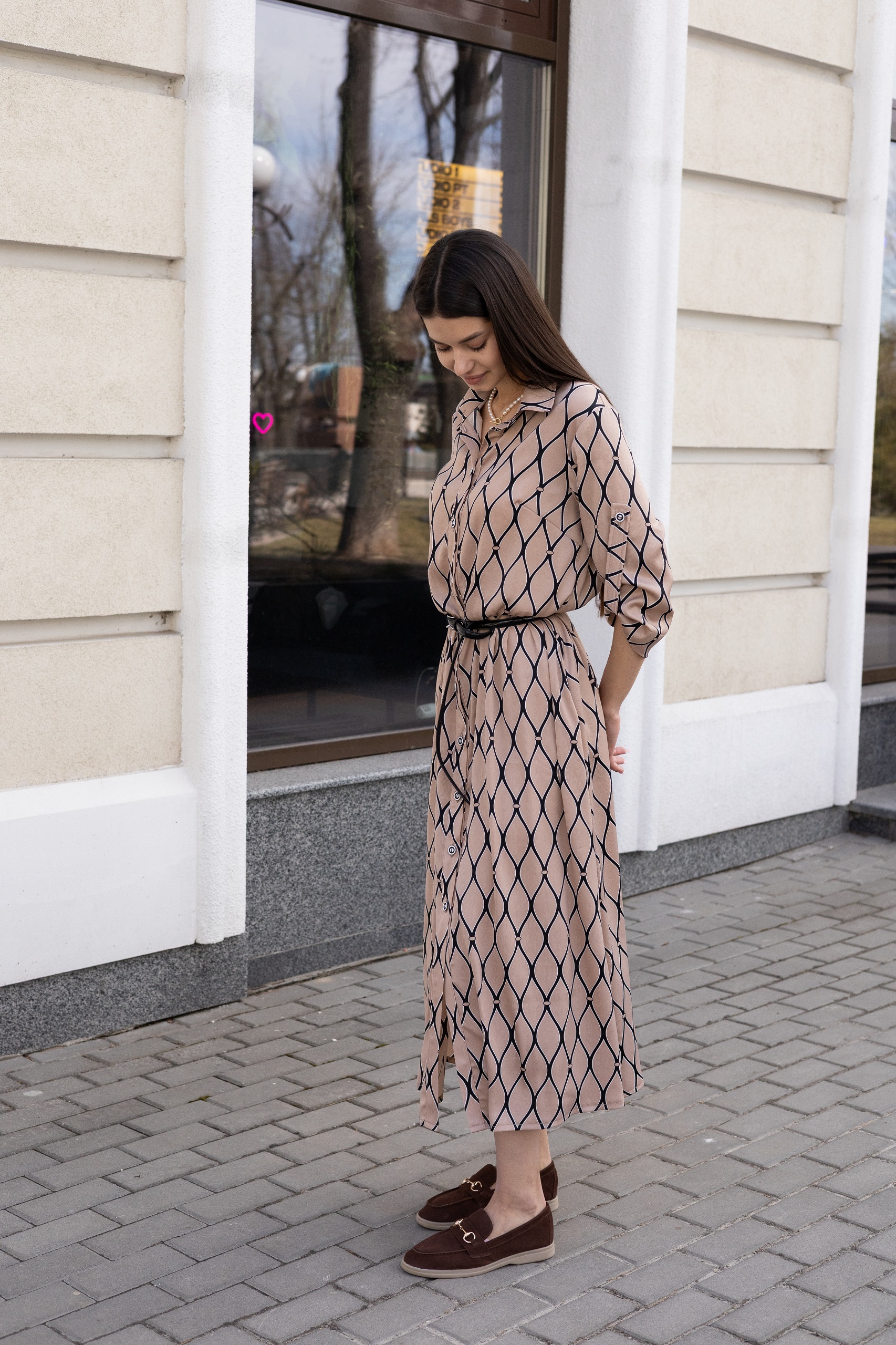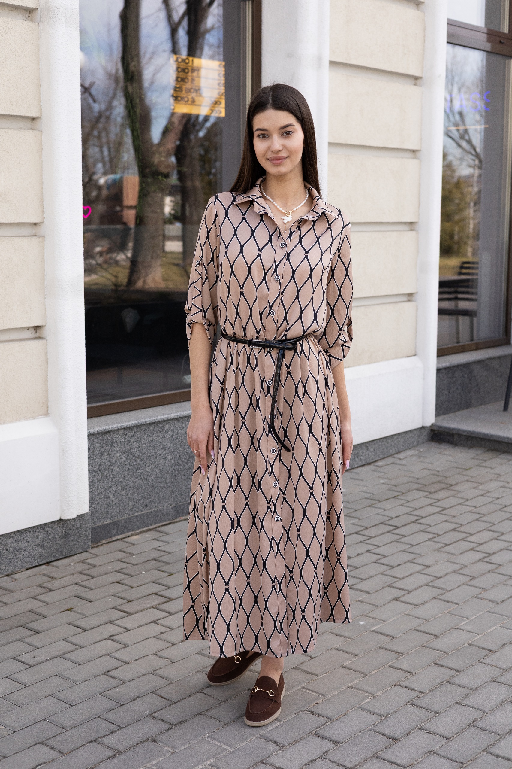 Это элегантное платье-рубашка — идеальное сочетание комфорта и утонченного стиля. Модель выполнена в приятном бежевом оттенке с контрастным геометрическим узором, который визуально вытягивает силуэт.