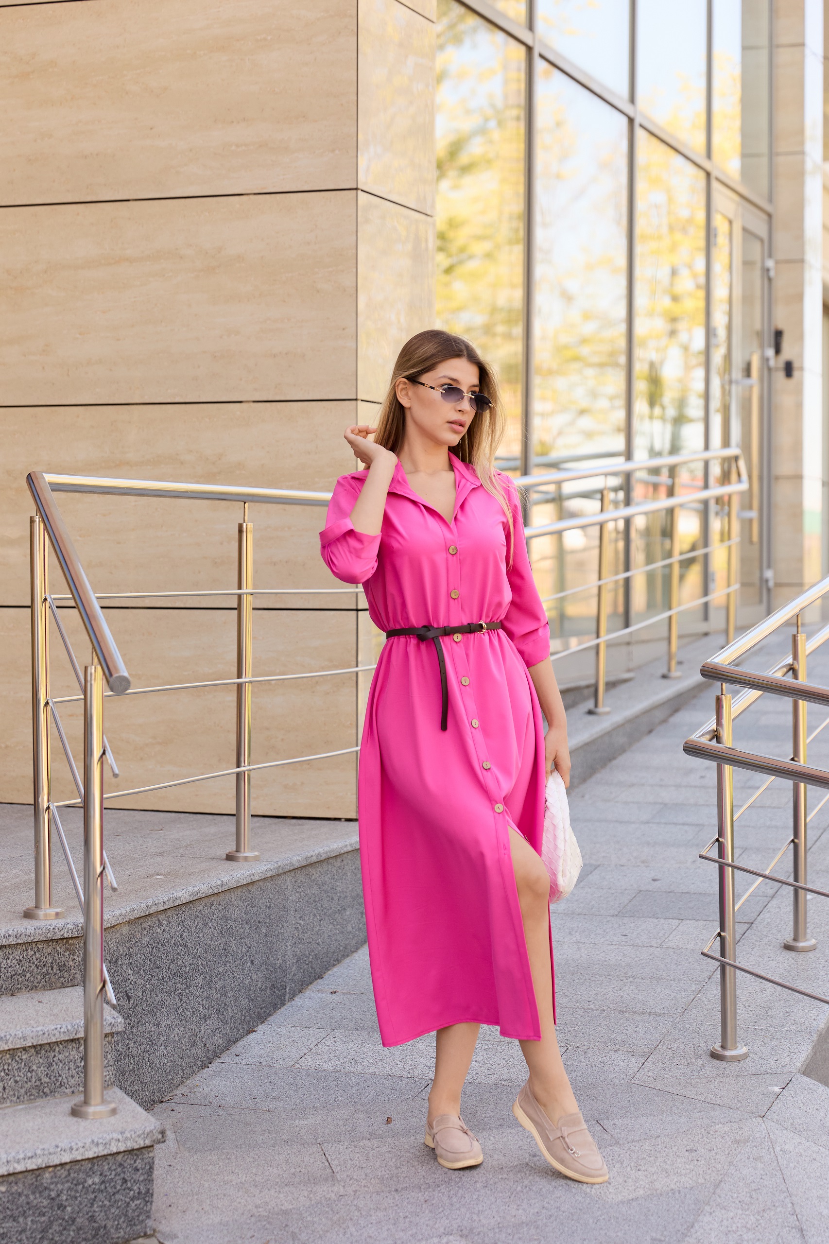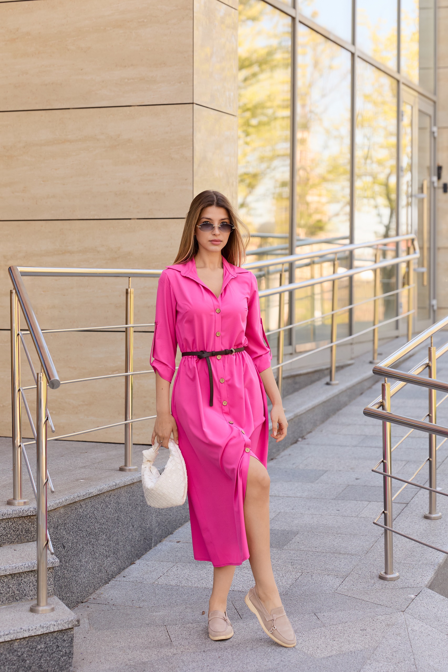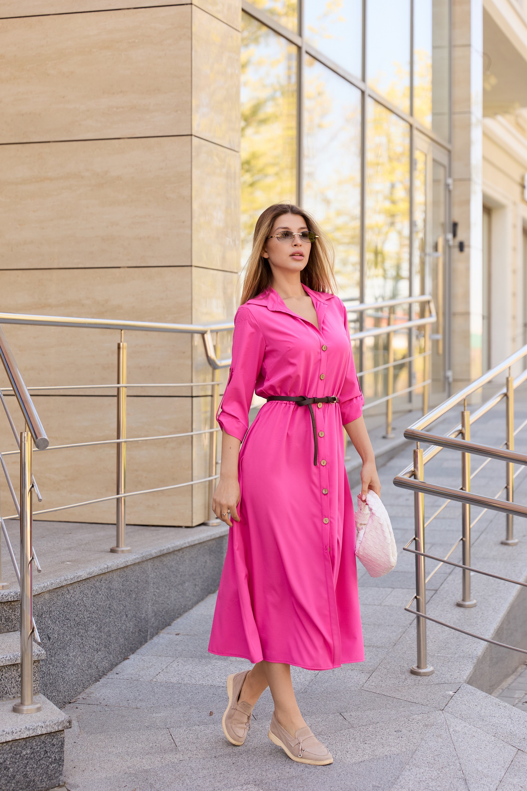 Благодаря легкой ткани, рукавам на пуговицах, поясу и расклешенной к низу юбке, можно менять образы и сочетать с обувью на каблуке и даже с кедами или кроссовками.