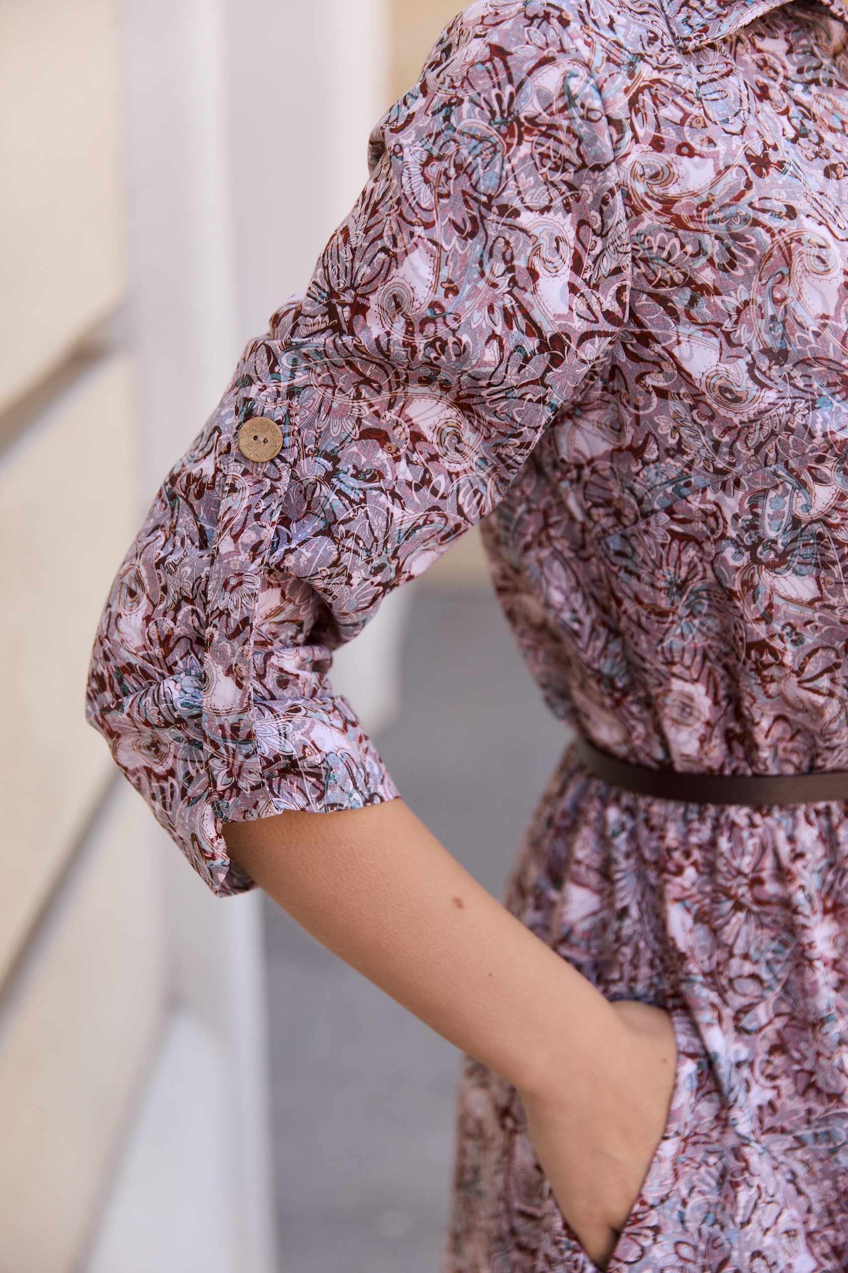 Благодаря легкой ткани, рукавам на пуговицах, поясу и расклешенной к низу юбке, можно менять образы и сочетать с обувью на каблуке и даже с кедами или кроссовками.
