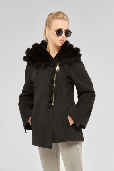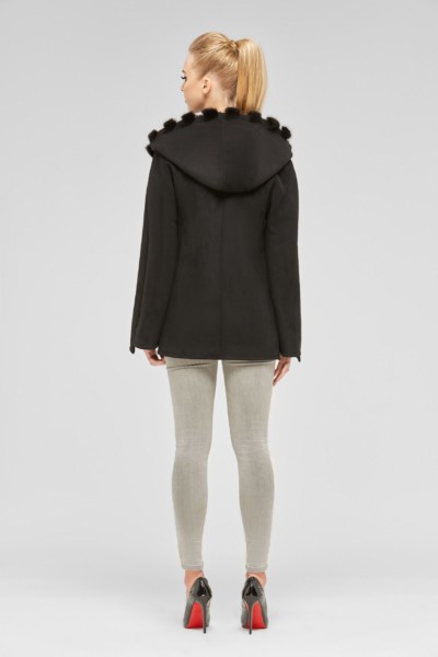Несъемный капюшон из искусственного меха, застежка на стильные пуговицы.