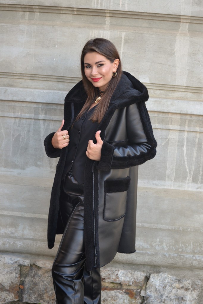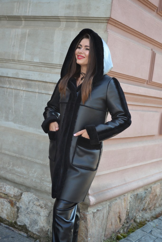 Удлиненная эко дубленка прямого силуэта с капюшоном с меховой отделкой.