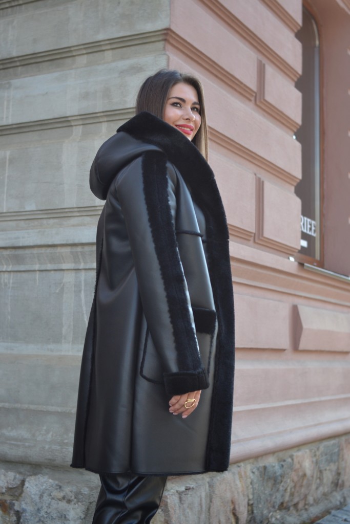 Универсальная зимняя Дубленка Д-159кап в черном цвете.