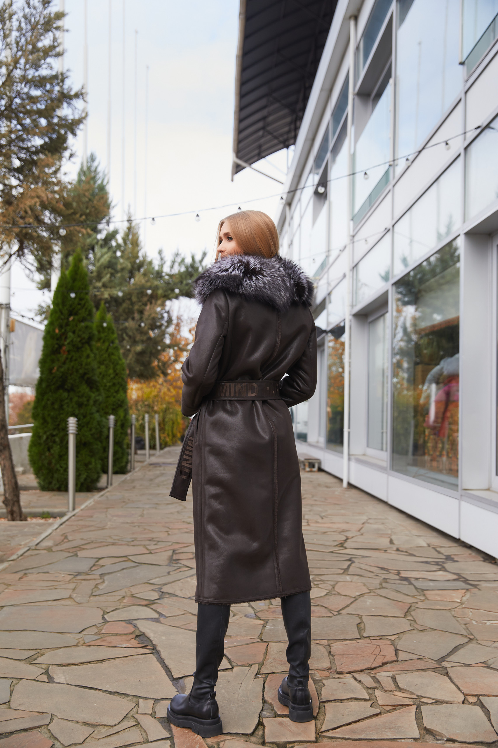 Эко дубленка с воротником из натурального меха чернобурки .В комплекте идет пояс с эксклюзивной вышивкой.