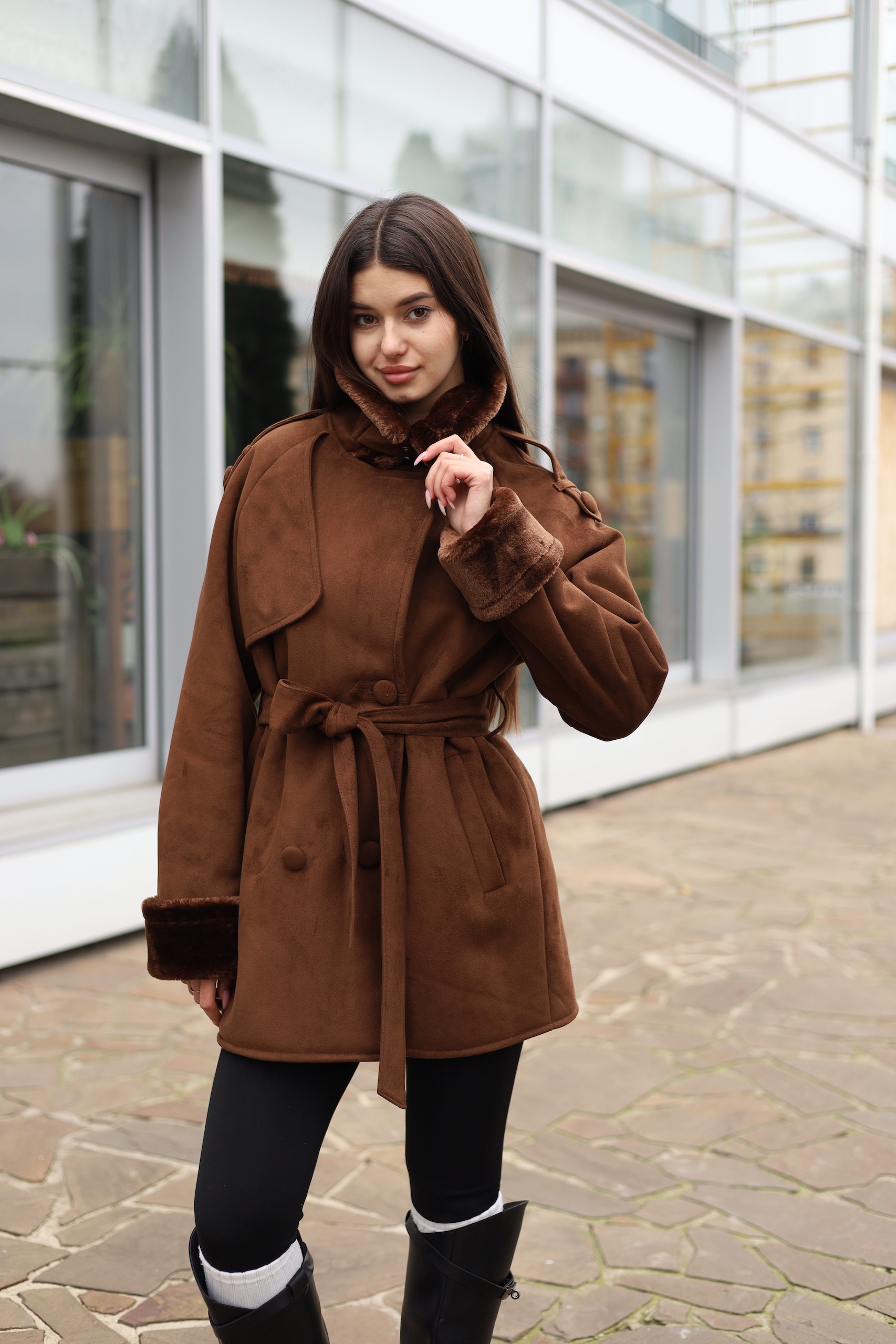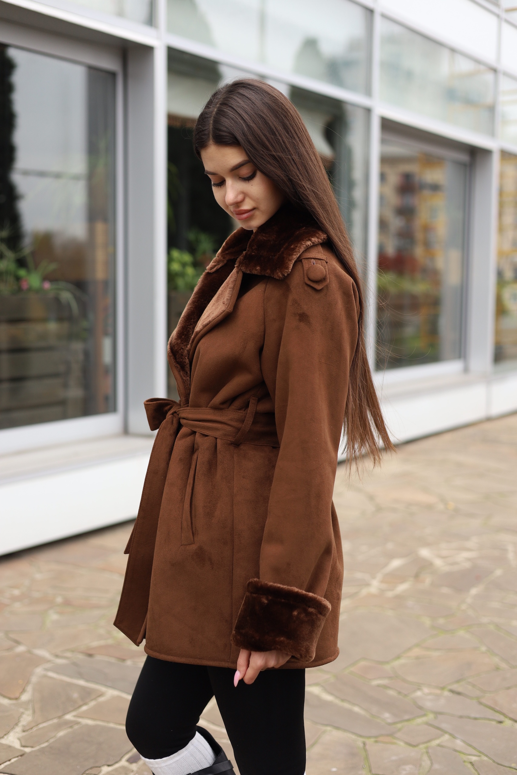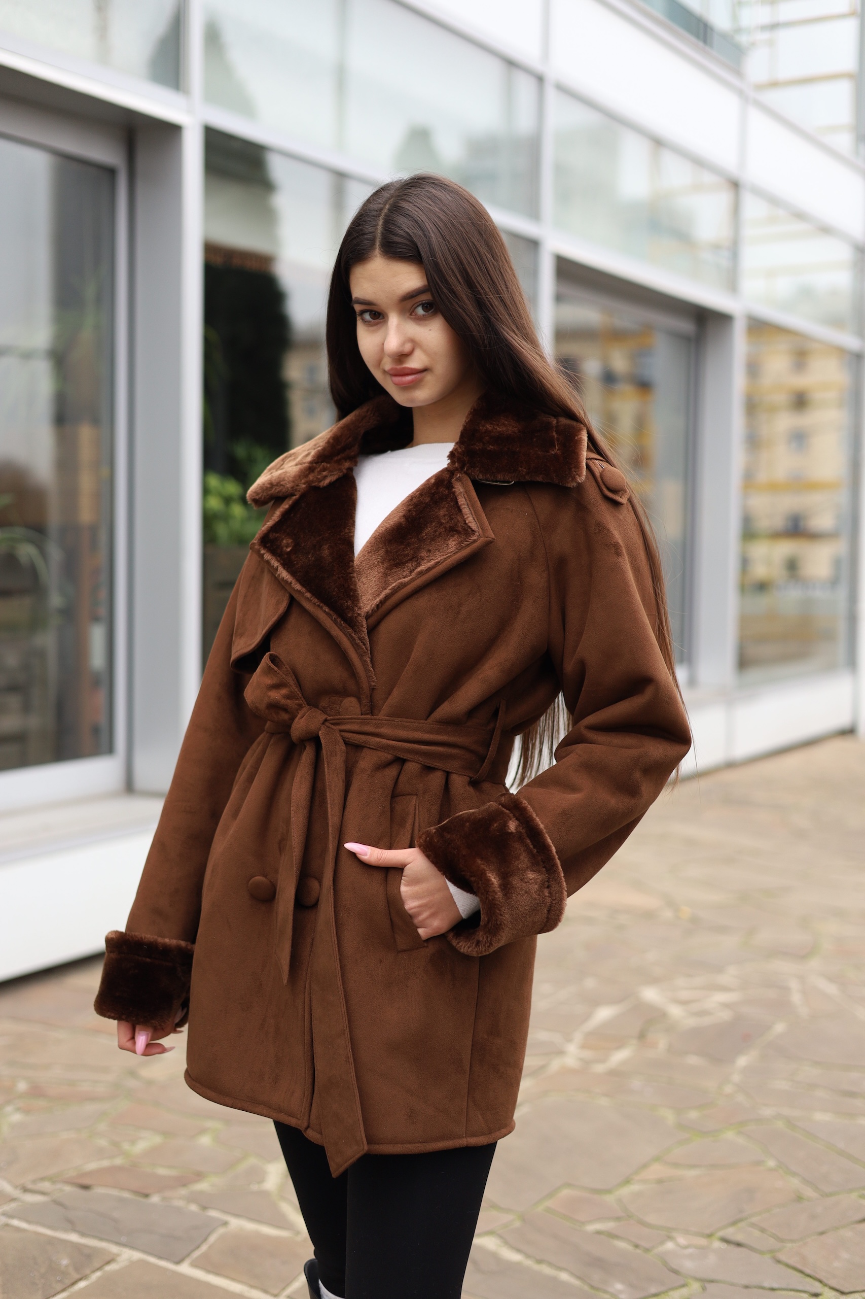 Эко дубленка прямого силуэта с поясом