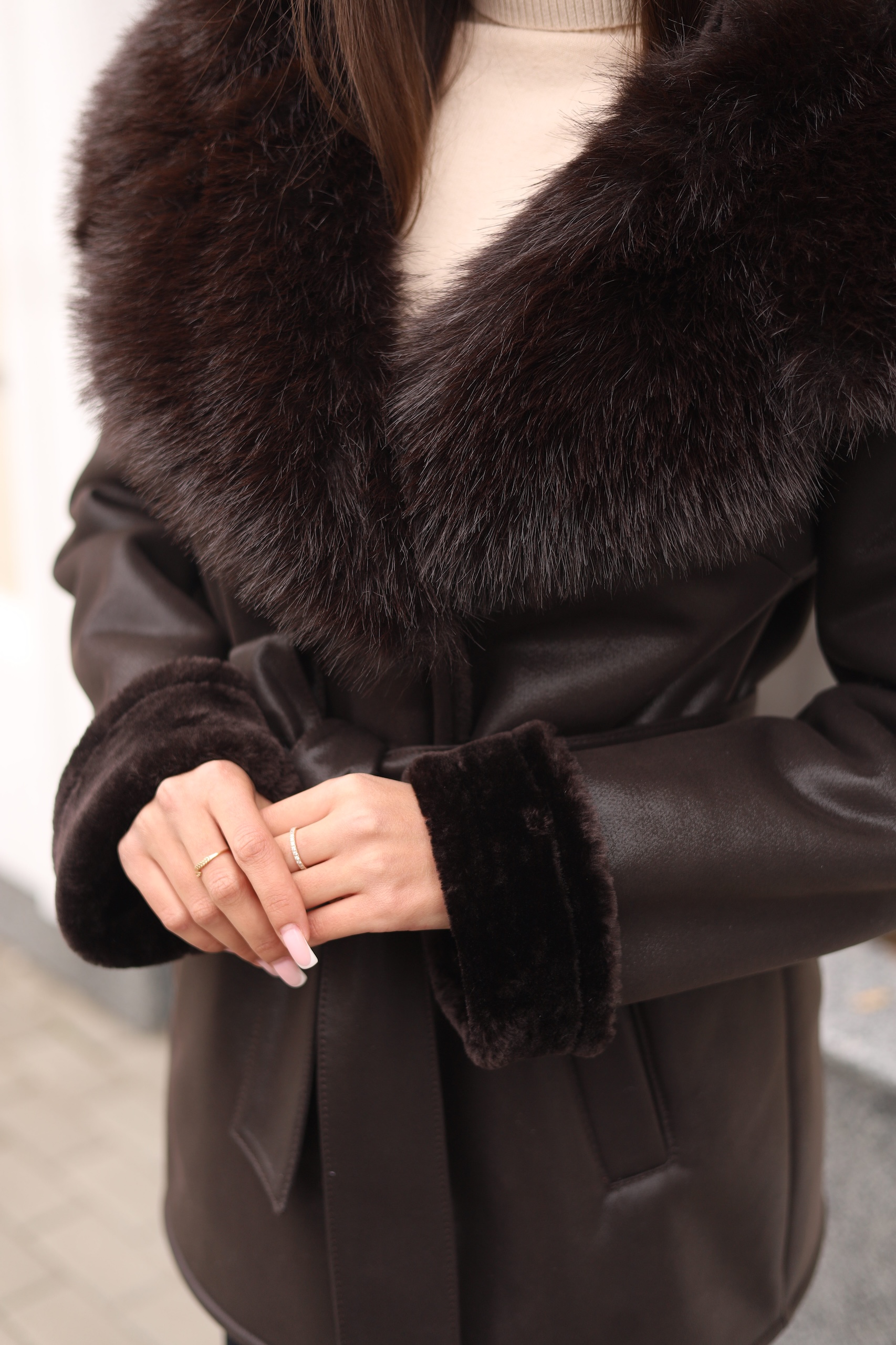 Эко дубленка прямого силуэта с поясом, на капюшоне экомех премиум качества под лисичку