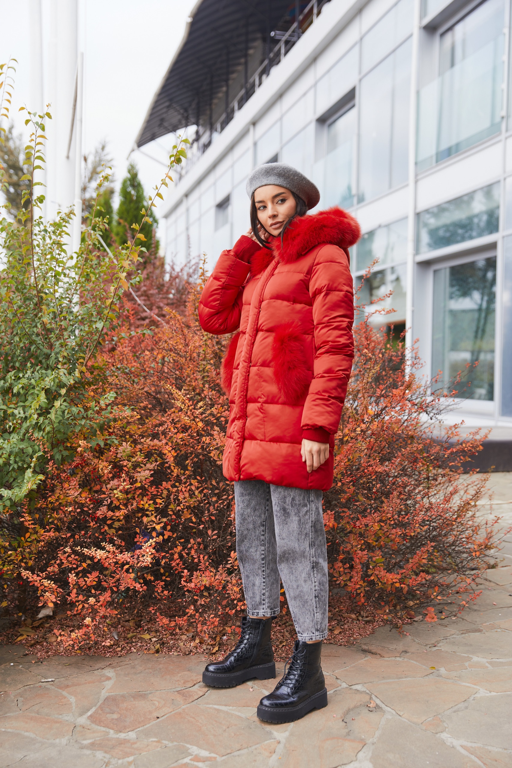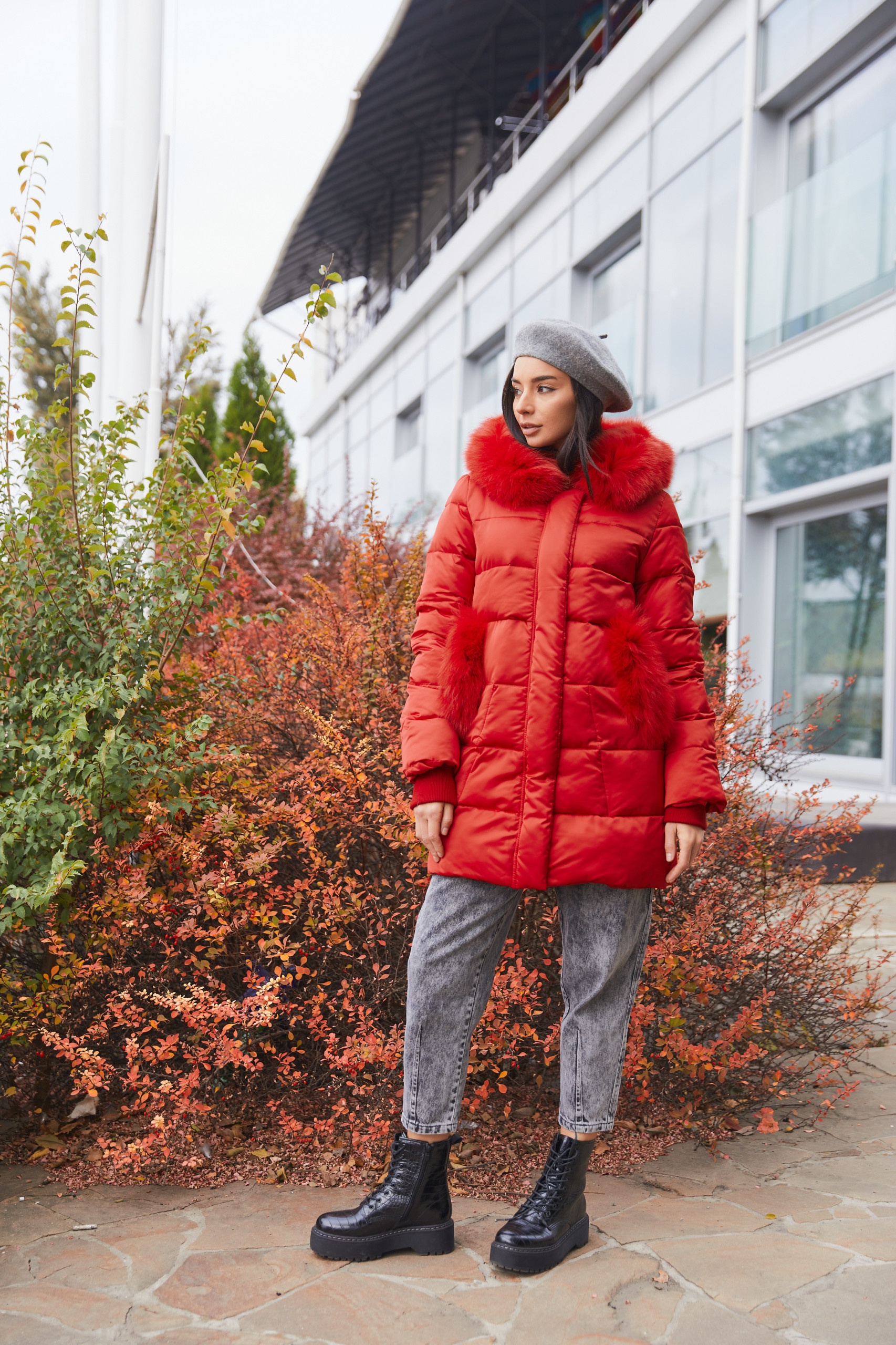 Зимний пуховик из атласной водонепроницаемой плащевой ткани с натуральным мехом песца.