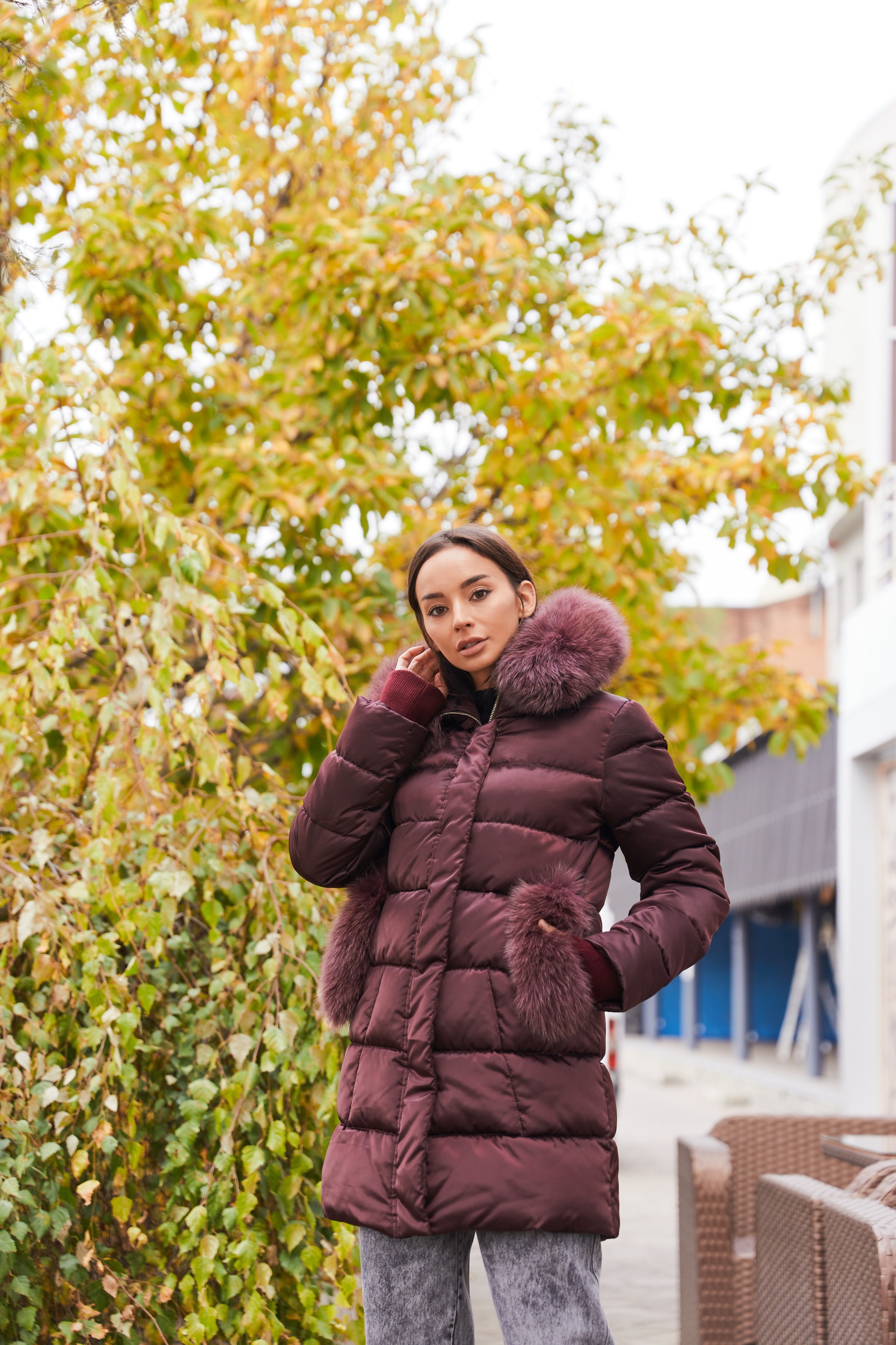 По краю капюшона и на карманах натуральный мех песца. Мех съемный.
