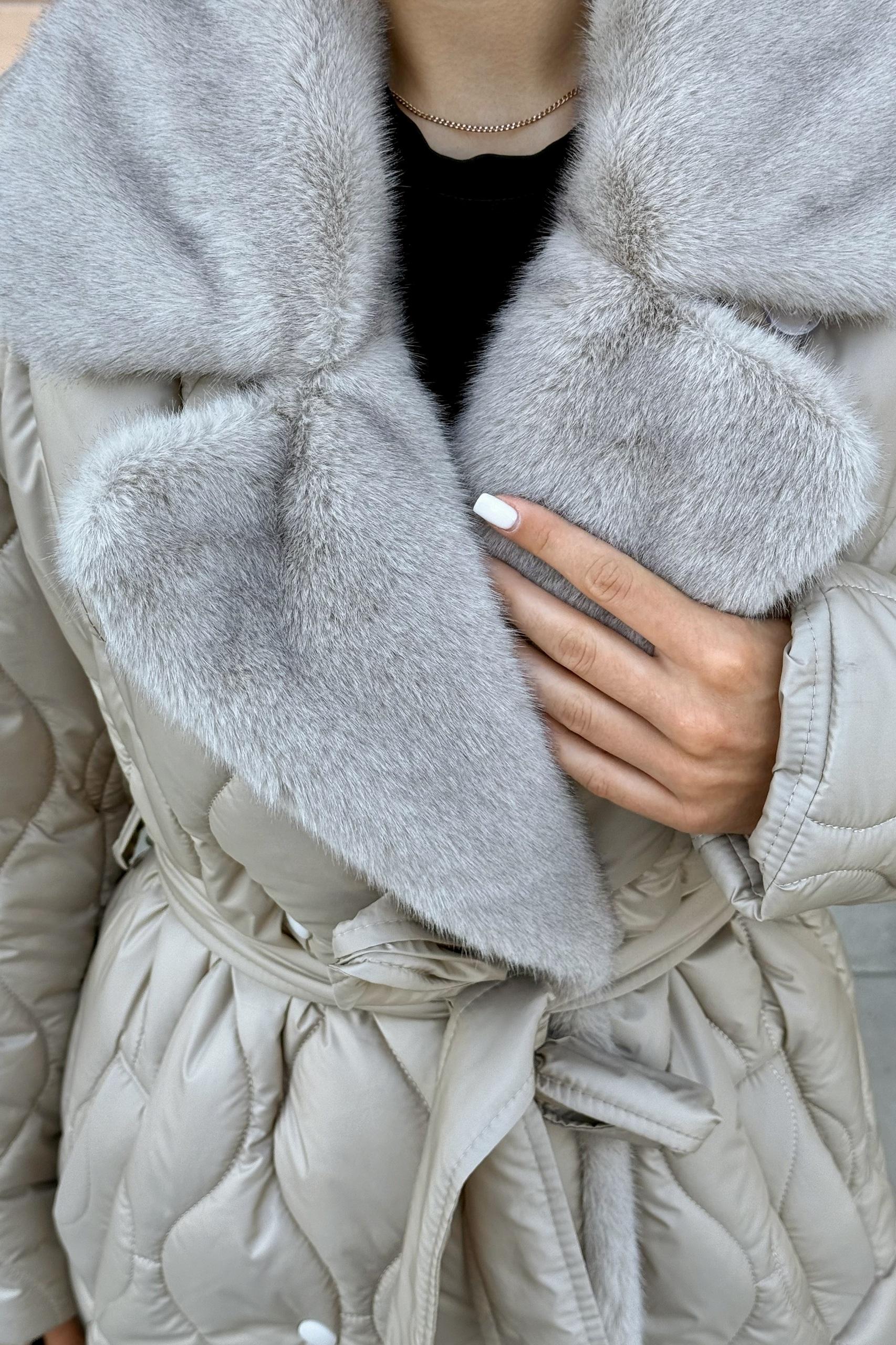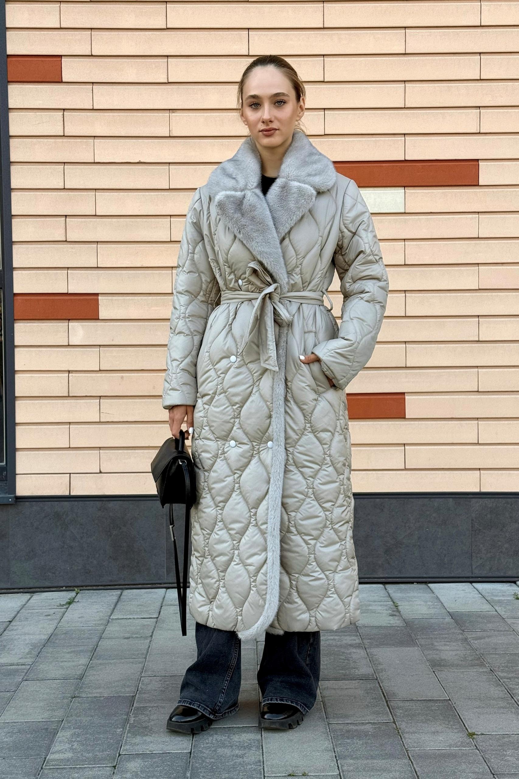 Стеганое пальто из водоотталкивающей матовой плащевки с эко мехом на вороте и обромкой по всей длине.