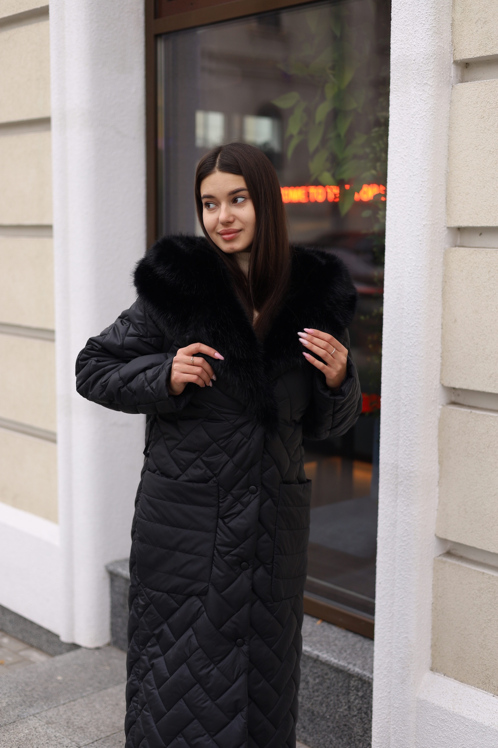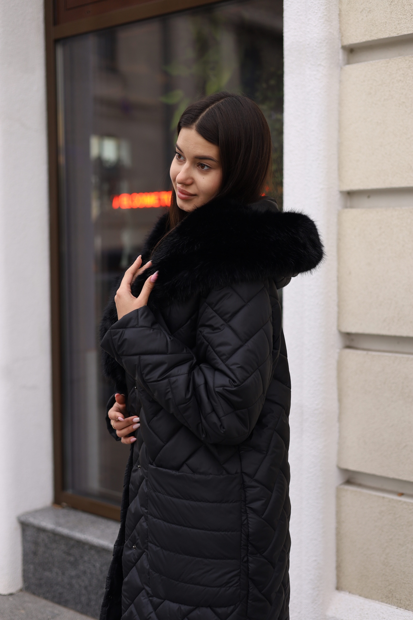 Зимнее пальто из водоотталкивающей плащевки с капюшоном. На капюшоне опушка из эко меха под лису.