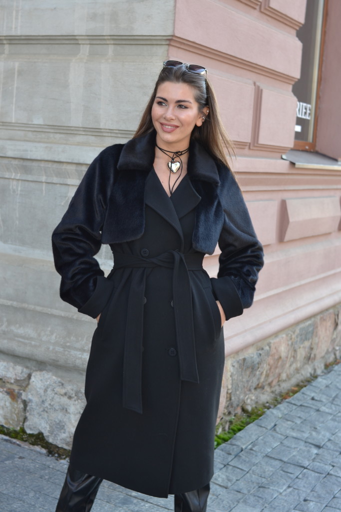 Зимнее двубортное пальто-тренч из кашемира с отделкой из эко меха под норку