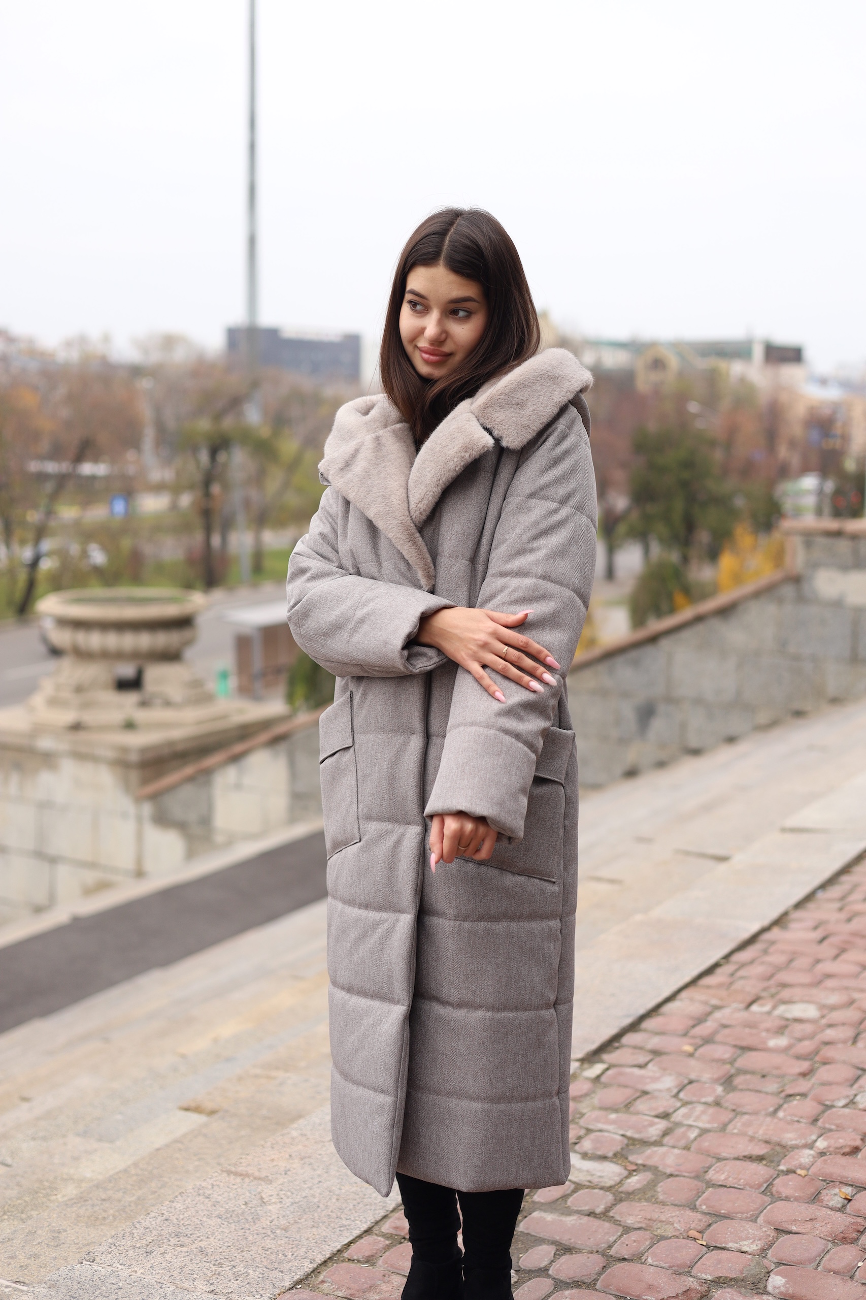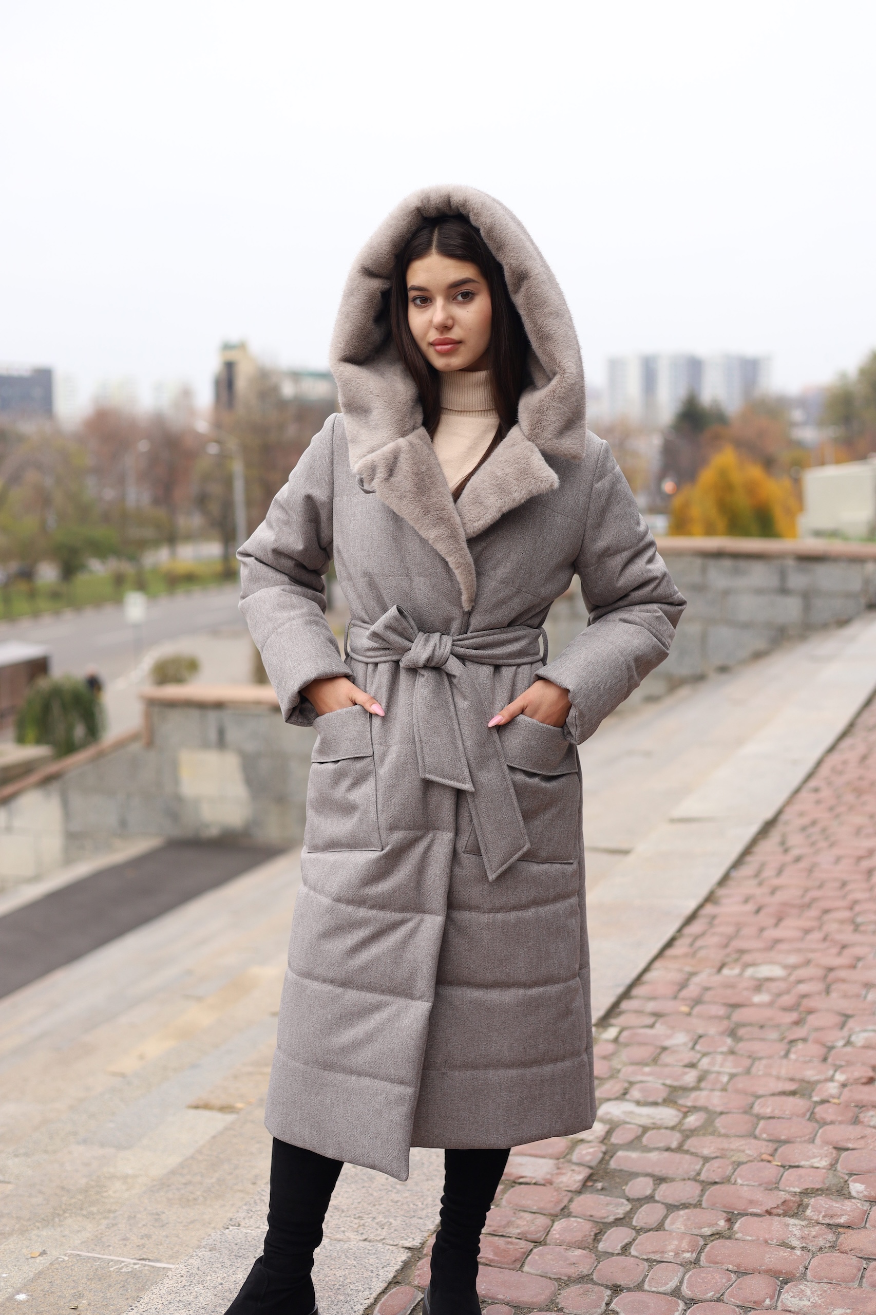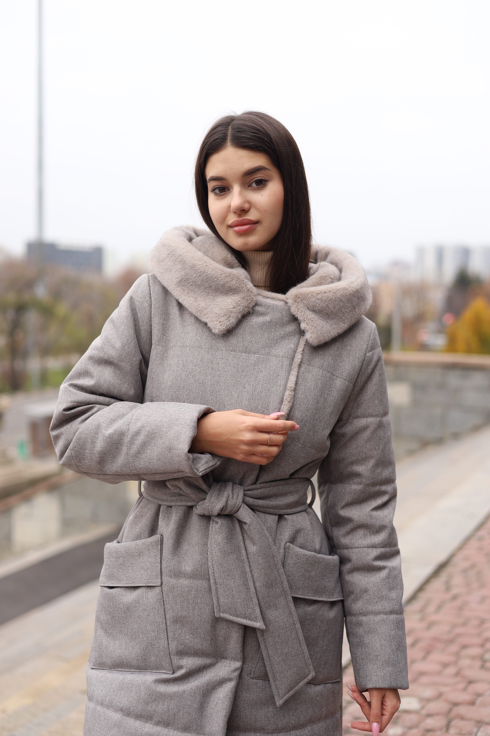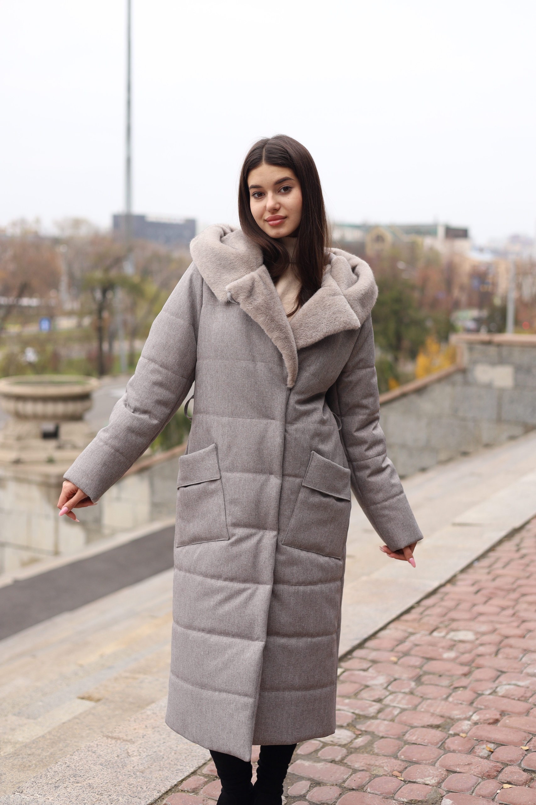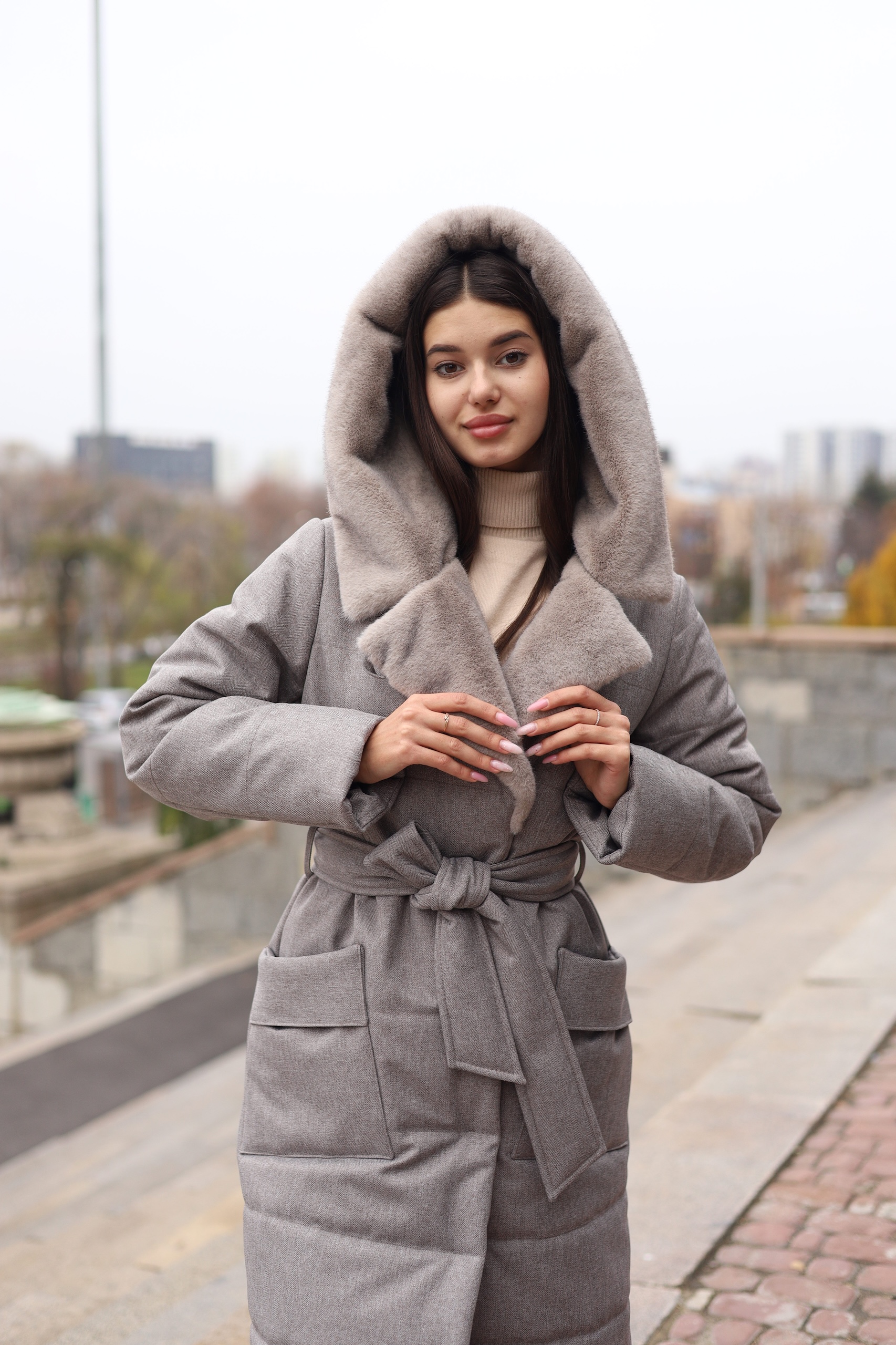 Зимнее пальто из фактурной плащевки с капюшоном. На капюшоне опушка из эко меха под норку.