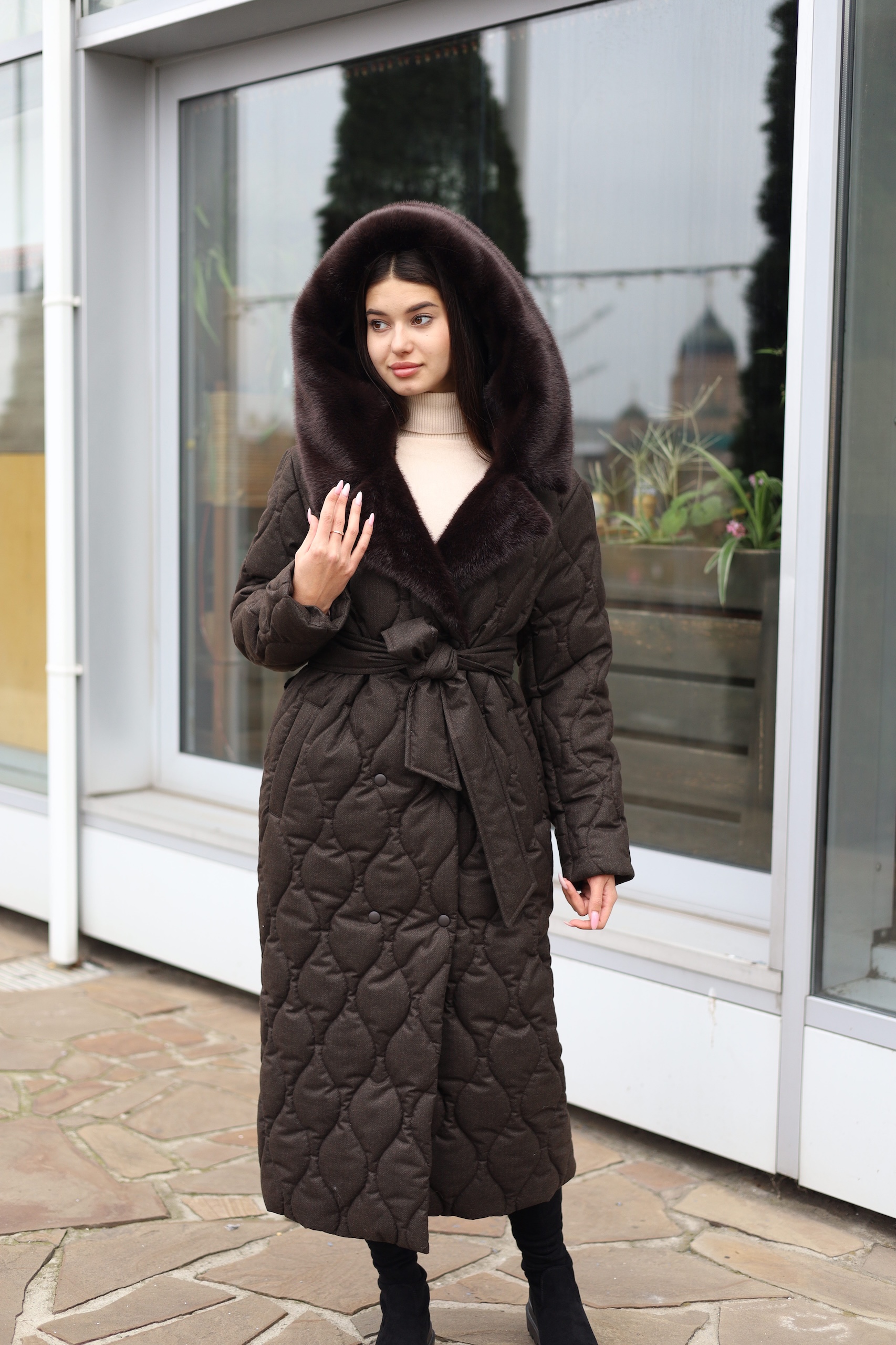 Стеганое пальто из фактурной плащевки с капюшоном. На капюшоне опушка из эко меха