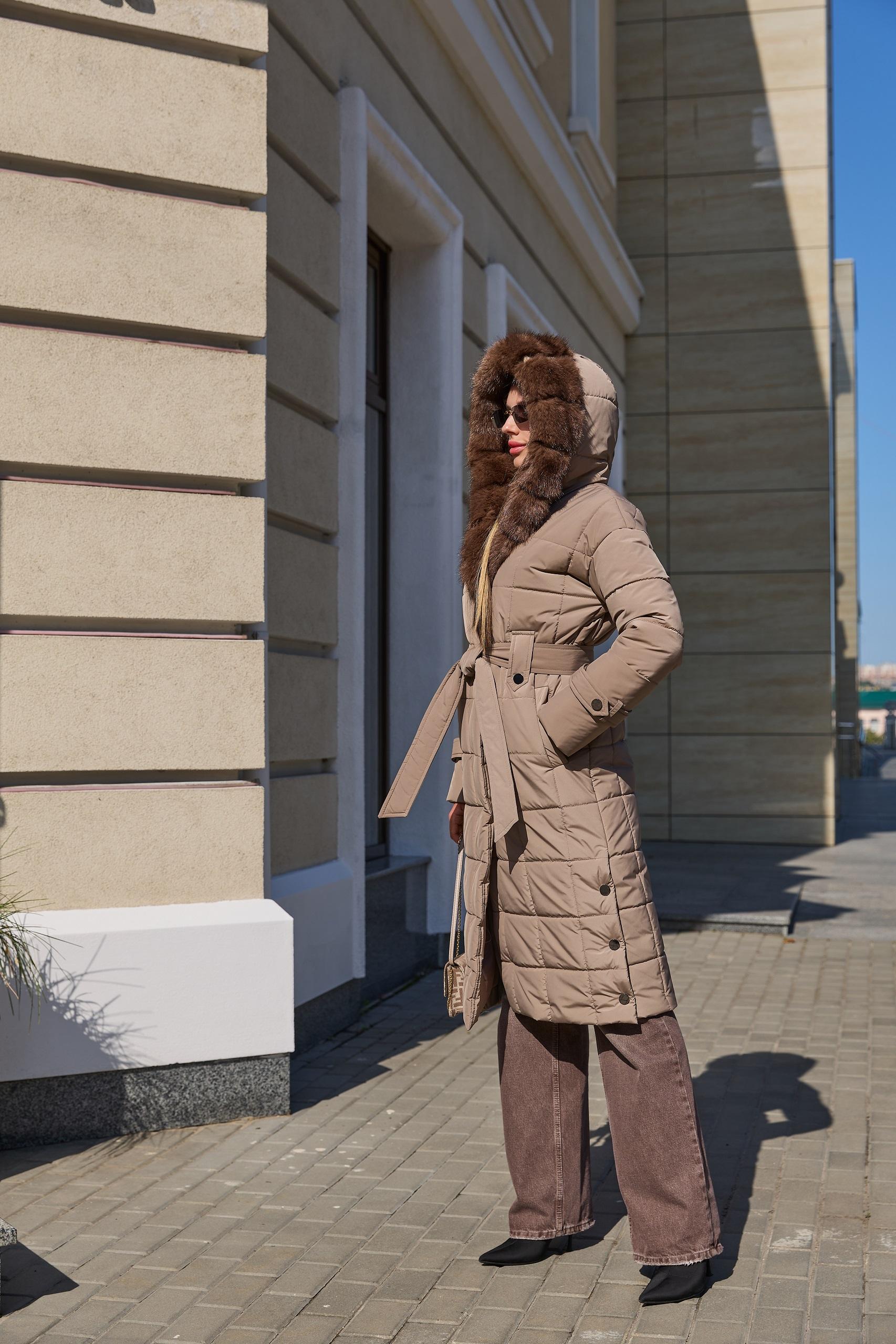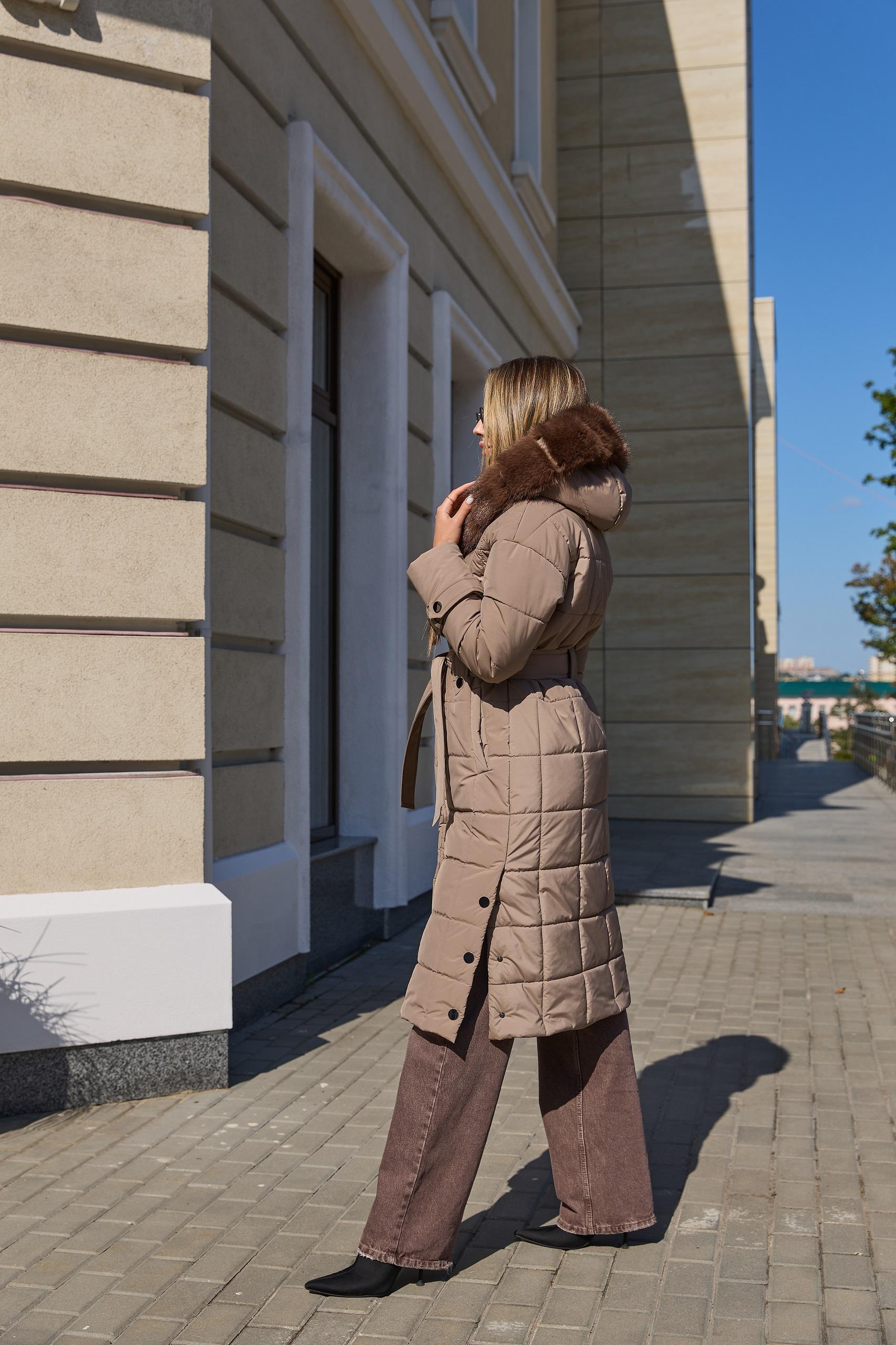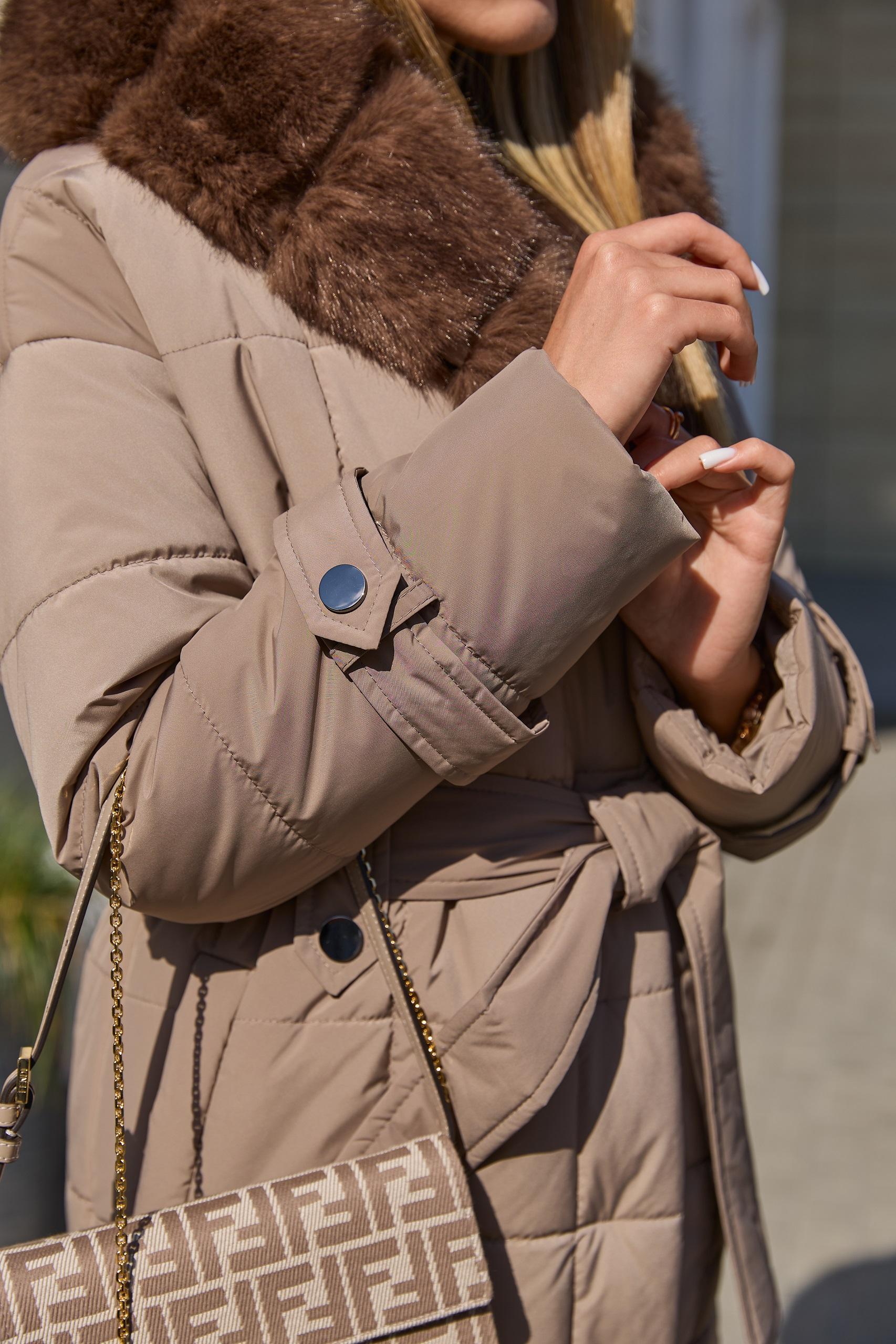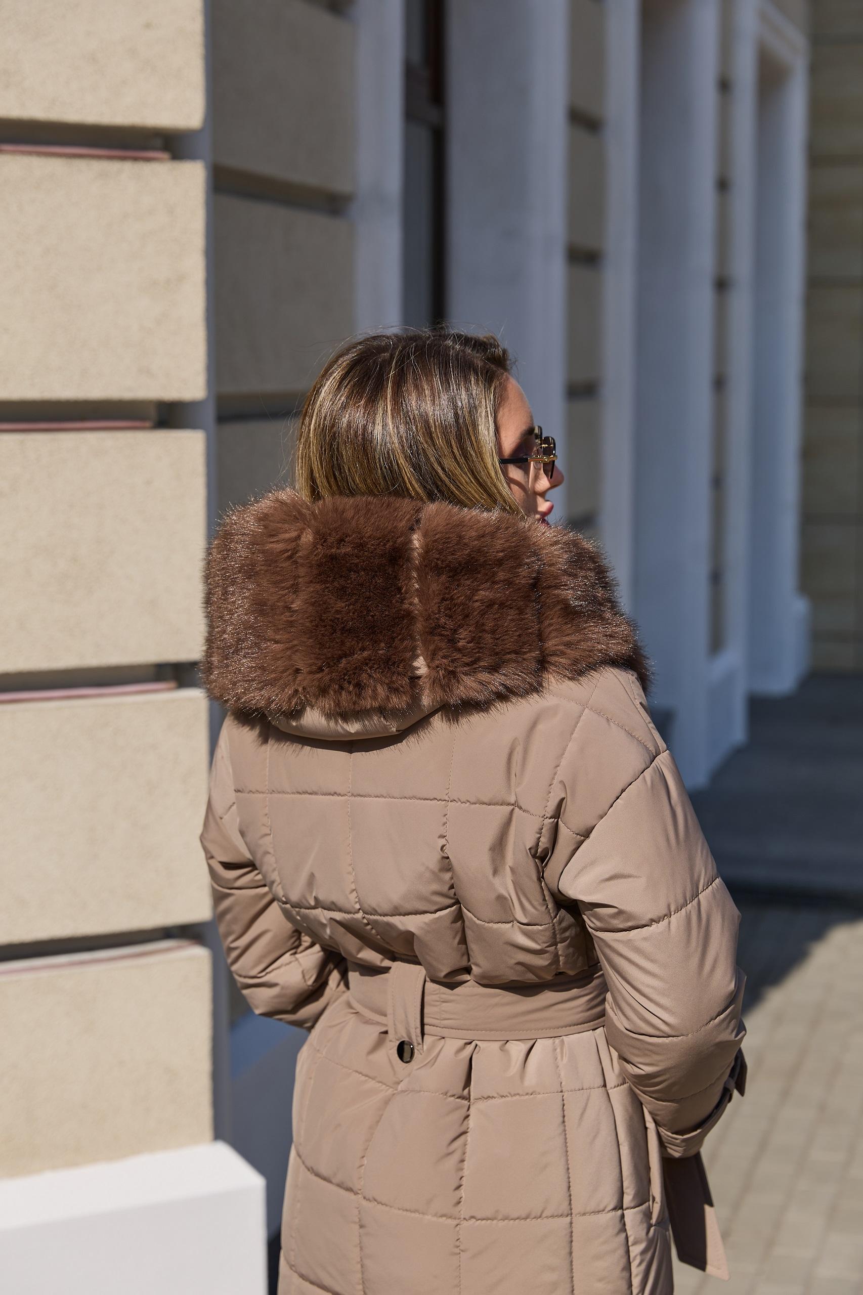 Зимнее пальто с капюшоном из стеганой водоотталкивающей плащевой ткани и эко мехом.