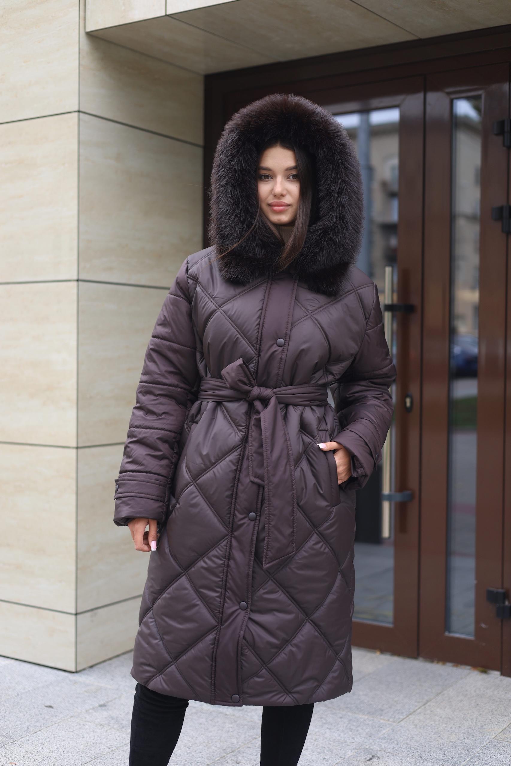 Зимнее стеганое пальто с водоотталкивающей плащевки и эко меха под лисичку на капюшоне